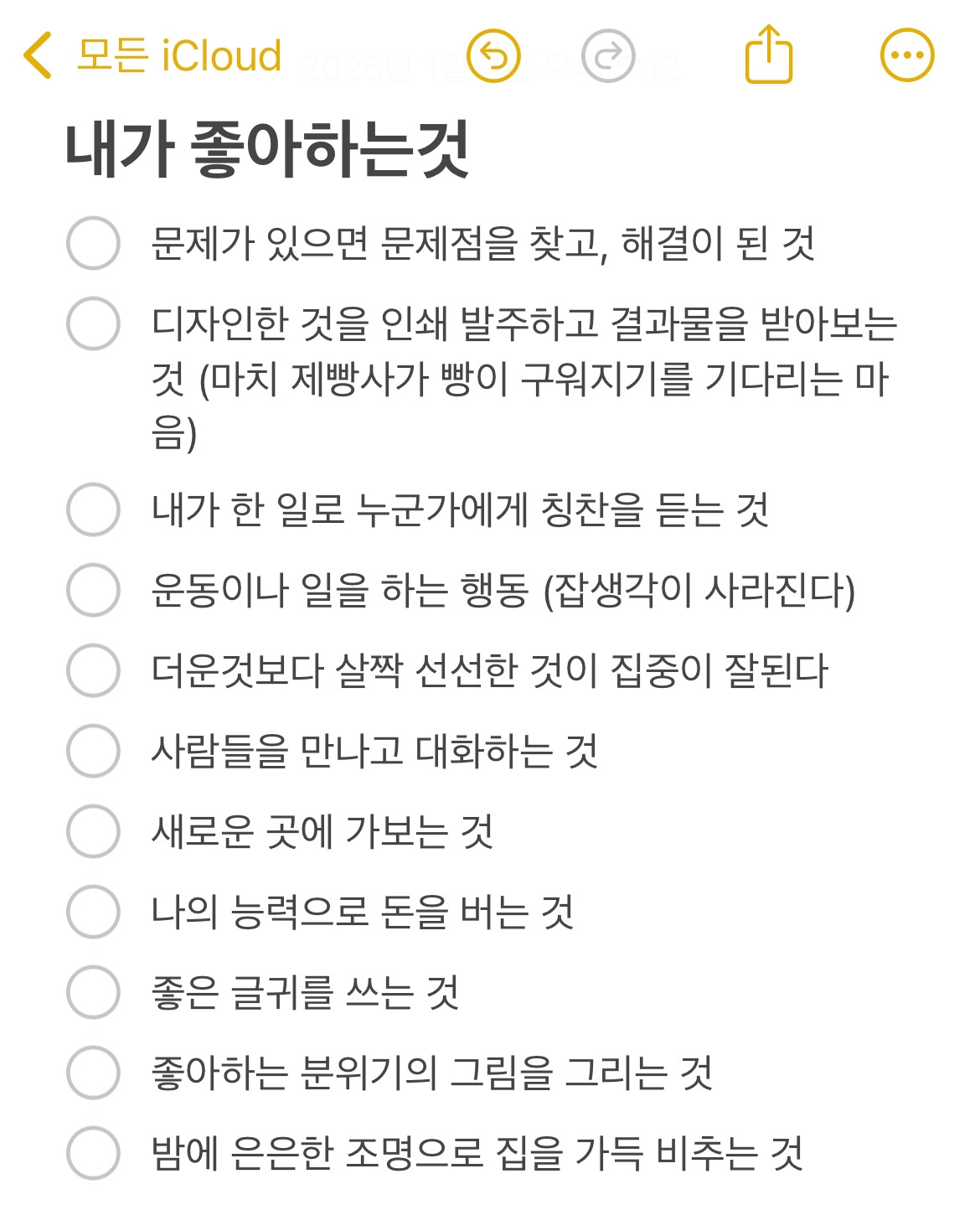 내가 무엇을 좋아하는지, 무엇을 싫어하는지 차근차근 정리해 보자. 혹시라도 본인이 당장 무엇을 해야 할지 모르겠다면 메모장에 좋아하는 써보며 하나씩 해보는 걸 추천한다. 화려하거나 대단한 게 아니어도 된다. 누군가에게 보여주기 창피한 것들도 괜찮다. 그저 나만 좋으면 되니 뭐 어떤가. 그렇게 미묘한 것들이 하나둘씩 모이다 보면, 결국 나의 모습이 만들어지니.