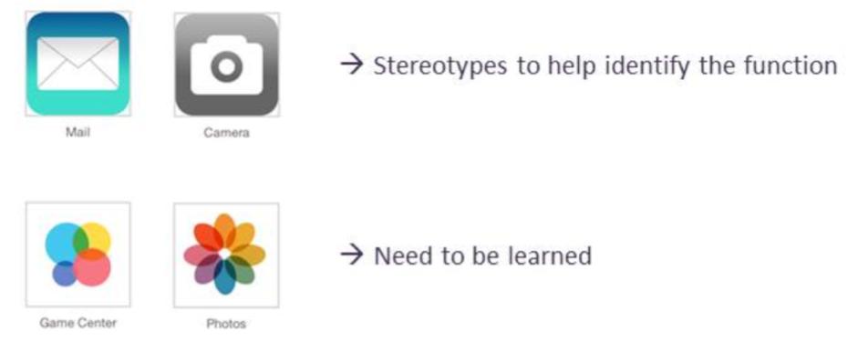 이는 '보인대로 작동한다'라는 이상적인 어포던스를 이용하는 방법으로 모바일 앱 아이콘을 디자인할 때, 학습이 필요한 디자인을 사용하는 것보다 메타포와 선입견을 활용하여 디자인하는 것이 효과적입니다.