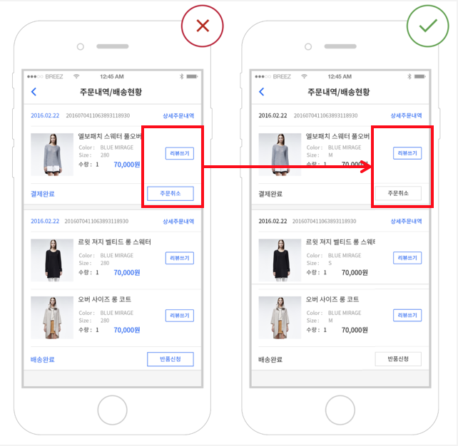 또한, 쇼핑 앱에서 주문 취소가 아니라, 리뷰 쓰기 등 유도하고 싶은 동작에 어포던스를 적용하는 방법이 그 예입니다.