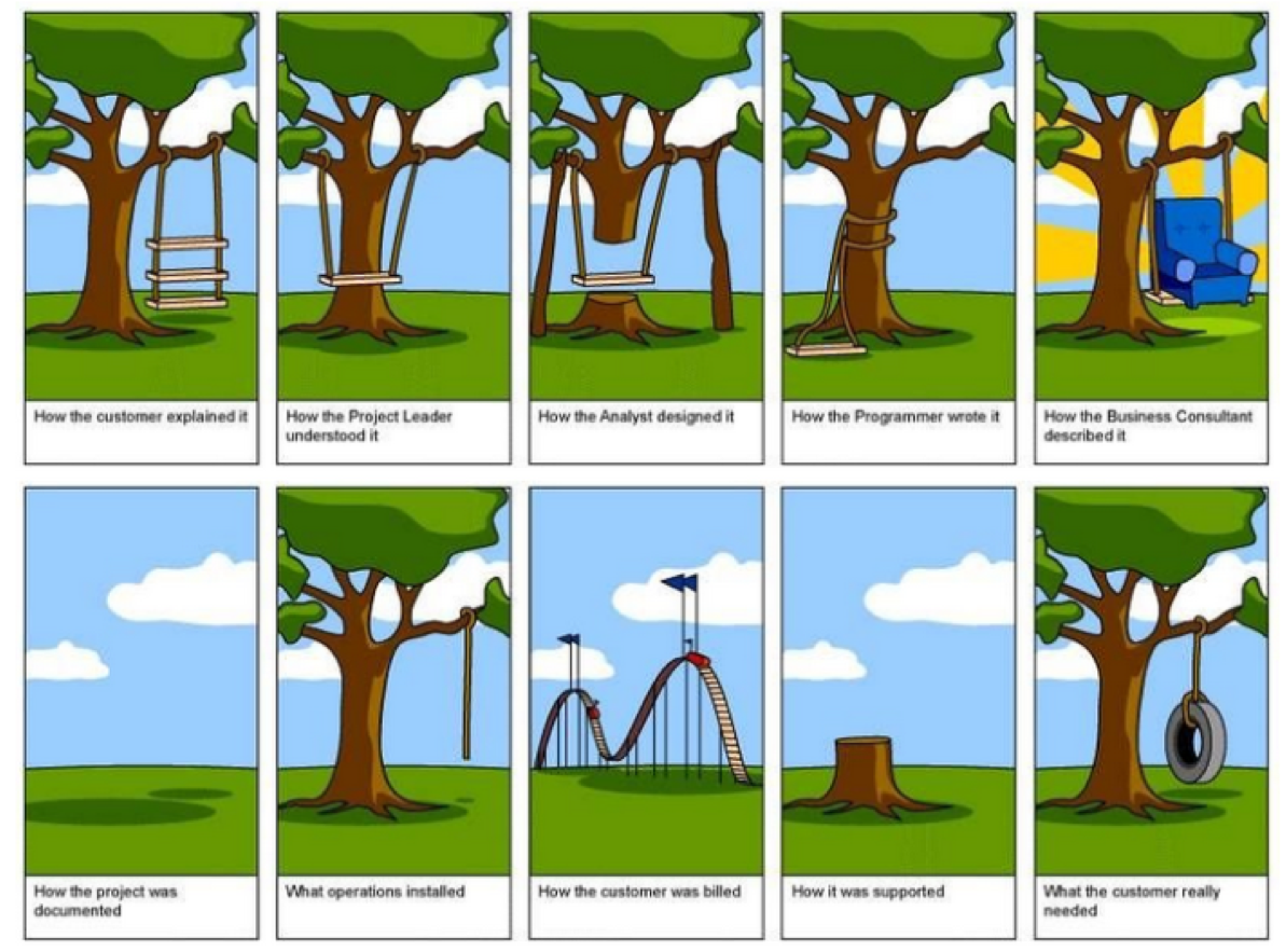 위 그림은 UX가 왜 중요한지에 대해 설명할 때 가장 많이 나오는 그림인데요, 이 그림에서는 다양한 이해 관계자들이 고객의 요구를 듣고 완성한 그네가 나옵니다. 첫 번째 그림부터 우측 하단으로 내려가 볼까요?