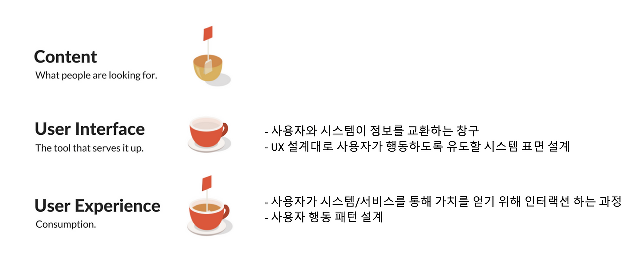 위 그림은 사용자 경험, 인터페이스, 그리고 콘텐츠와의 관계를 차와 찻잔으로 표현한 그림입니다. 사용자 경험이라는 것은 찻잔에 담긴 차와 같아서 찻잔과 차가 서로 잘 어울려야 한다는 것입니다.