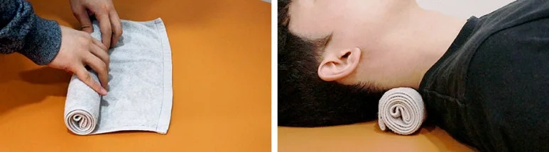 1. 얇은 수건 한두 개를 돌돌 말아 목 뒤에 받쳐준다. (목 디스크에 좋음)
