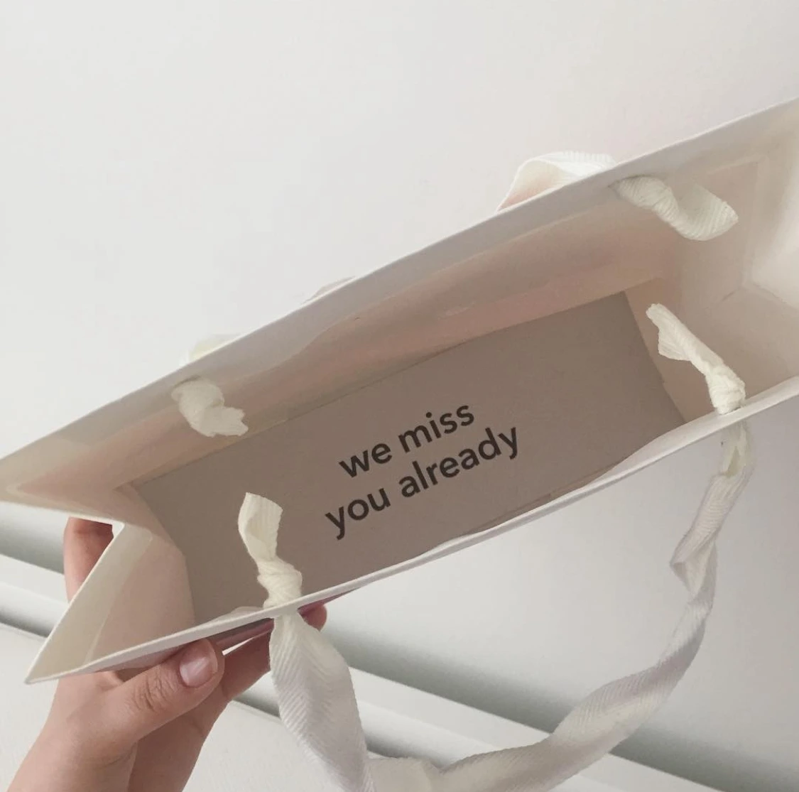 캐나다의 Aritzia라는 의류 부티크 브랜드가 있습니다. 당시 워홀러였던 저에게 Aritzia의 옷은 부담스러운 가격대였어요.(지금 생각해도 비싸네요...) 고심 끝에 구매하고 집에 돌아와 쇼핑백에서 옷을 꺼내는데 쇼핑백 바닥에 이런 문구가 써있었어요. "we miss you already." 이 문장 하나로 '비싼 옷을 산 기억'이 '또 가고싶은 기억'으로 바뀌었습니다.