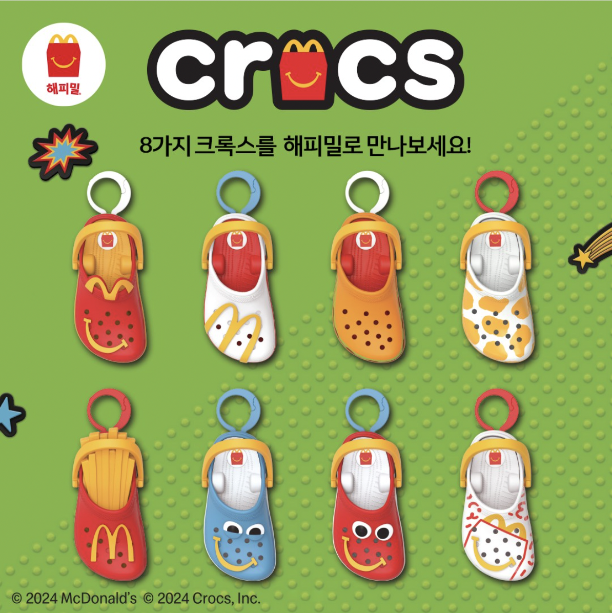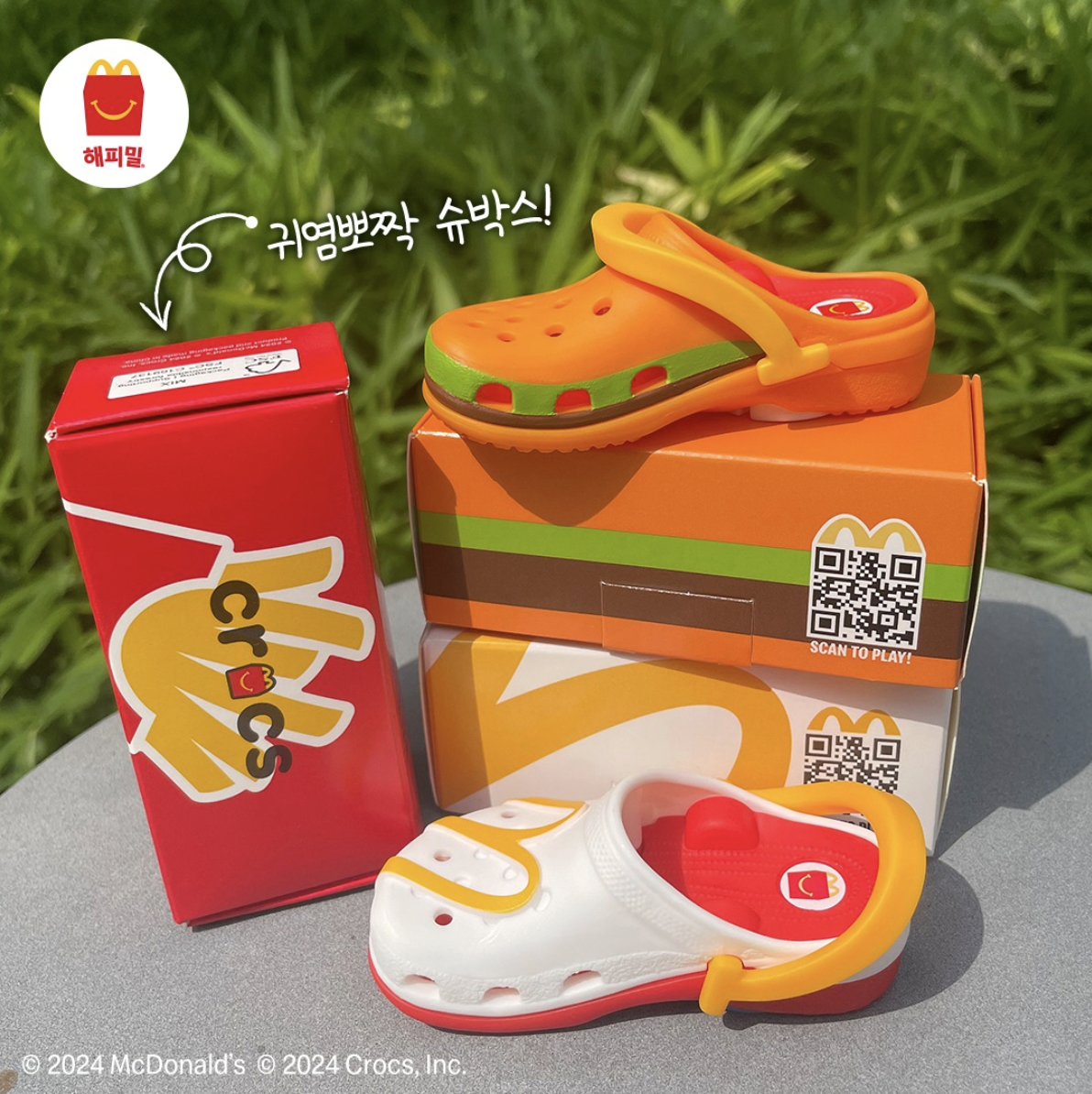 작년 9월 출시된 해피밀 키링입니다. 크록스를 아주 작은 사이즈로 구현했다는 것만으로도 귀여운데, 맥도날드의 빅맥, 감자튀김, 해피밀 IP까지 녹여냈어요. 그리고 이 키링이 담긴 슈박스도 참 귀엽습니다. 너 신발도 아니면서 슈박스에 담기는 거야?ㅠㅠ 심지어 키링을 꾸밀 수 있는 지비츠 스티커도 같이 제공된다니 제대로 크록스다운 키링이네요.