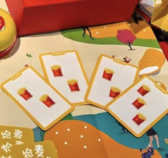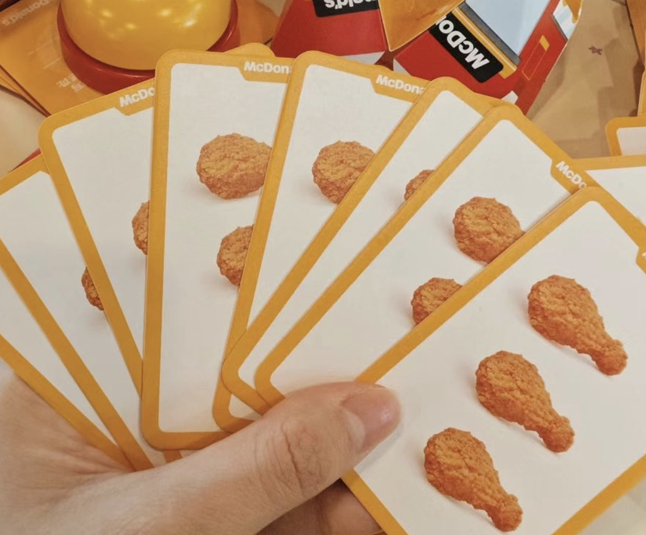 중국에서 출시된 할리갈리 세트입니다. 맥도날드를 상징하는 레드, 옐로우는 물론이거니와 원래였으면 과일이 그려져 있어야 할 카드에 맥도날드의 메뉴들이 채워져 있습니다. 혹시 할리갈리 룰을 모르신다구요? 닭다리가 다섯개가 됐을 때 Mc종을 치면 됩니다!