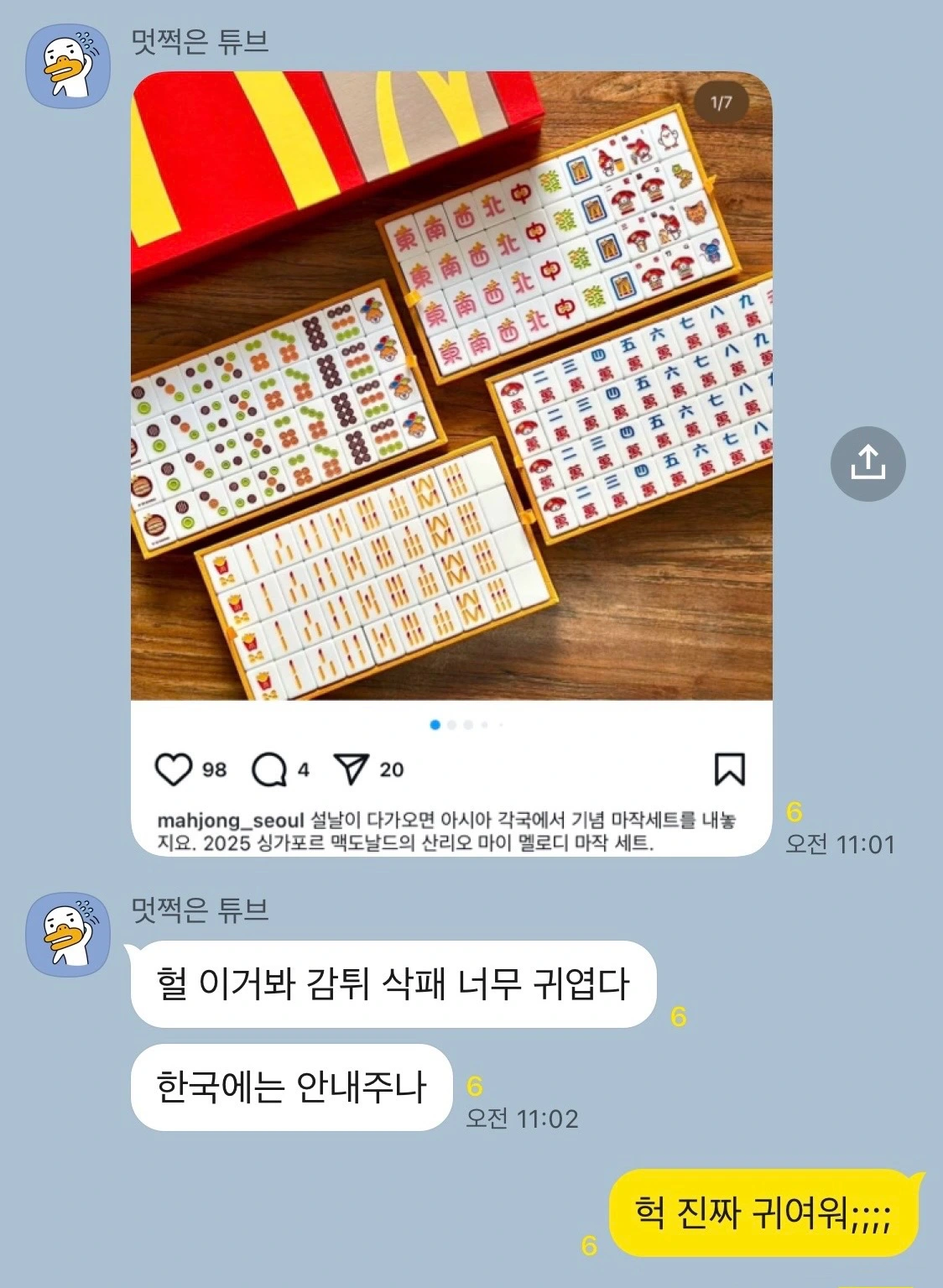 이걸 보니 재작년 맥도날드에서 추석을 맞아 내놓았던 한정판 윷놀이 세트가 생각났어요. 한 때 윷놀이에 빠져있던 저는 이것을 반드시 손에 넣고자 했지만 오픈런까지 벌어지며 출시 하루만에 소진되는 바람에 결국 실패하고 맙니다. 부리나케 달려간 맥도날드 유리창에 붙어있던 '윷놀이 품절' 공지가 아직도 눈에 훤해요.