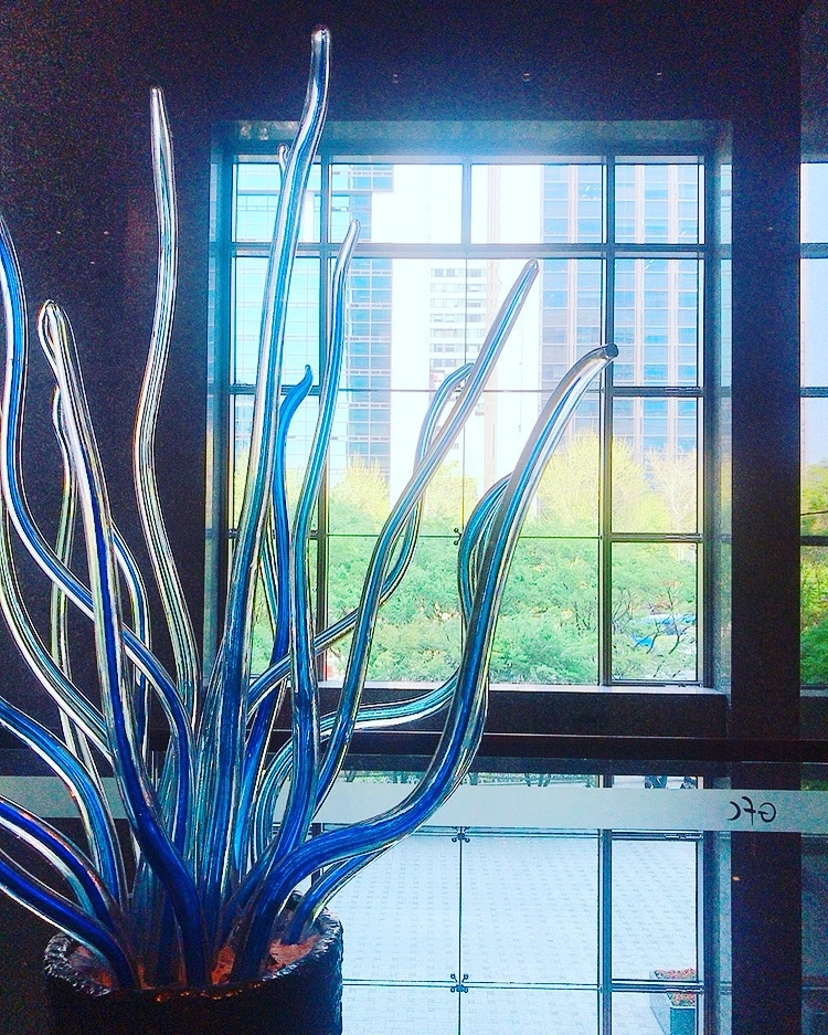 바람이 심하게 부는 화창한 날의 거리를 유리창을 통해 보았다. 새잎이 돋아 머리끝부터 노랑 초록으로 청량한 나무들을 바라보는 나는 건물 안의 한 유리조각 상 앞에 서 있었다. 파란 촉수가 사방으로 뻗쳐있는 작품이다.