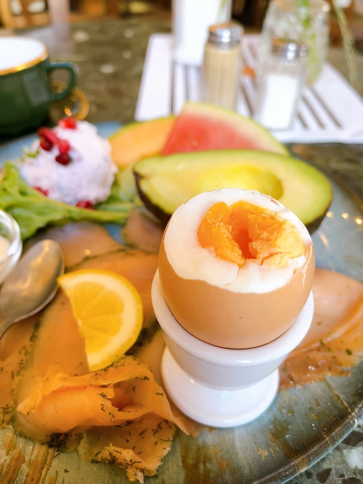 세트엔 삶은 달걀도 포함됐다. 유러피안들이 달걀 반숙을 전용 받침대에 놓고 먹는 걸 볼 때마다 ‘도대체 왜 저런 수고를 사서 하는 것일까? 껍질 까서 먹으면 될 것을? 보기도 번거롭게?’하고 생각했지만 이번엔 이들의 문화를 존중하고 또 경험삼겠다는 생각으로 처음으로 시도를 해보았다. 그런데 칼로 윗부분을 자르는 건 알았지만 과연 그 뚜껑에 있는 달걀도 먹는지에 관해서는 의문이었는데 옆테이블 독일 남자가 스푼으로 뚜껑의 달걀을 알뜰하게 퍼서 먹는 걸 관찰한 후 자연스럽게 따라했다.(하고보니 요플레 뚜껑에 묻은 요거트를 스푼으로 긁는 것과 같은 야무진 느낌)