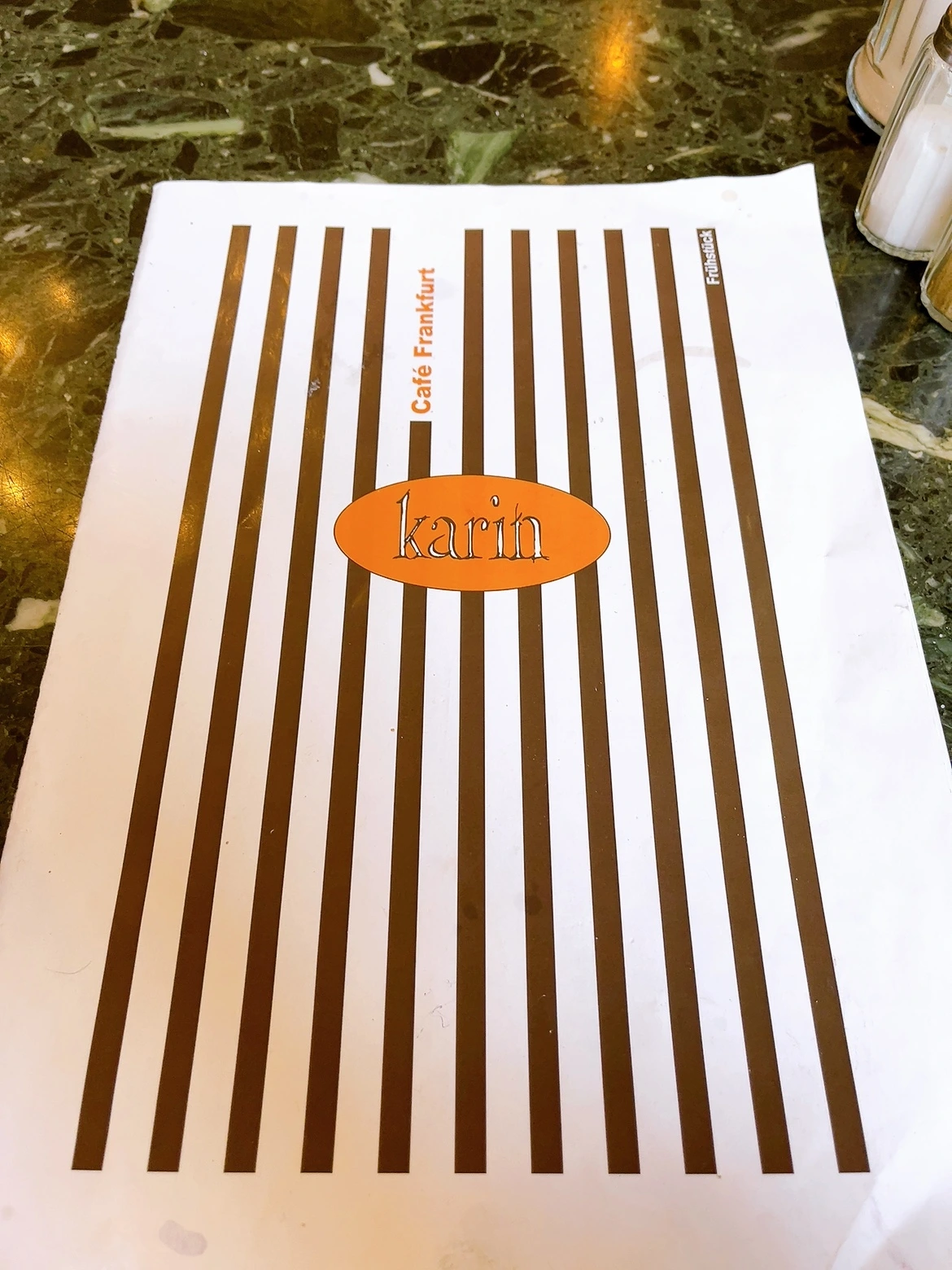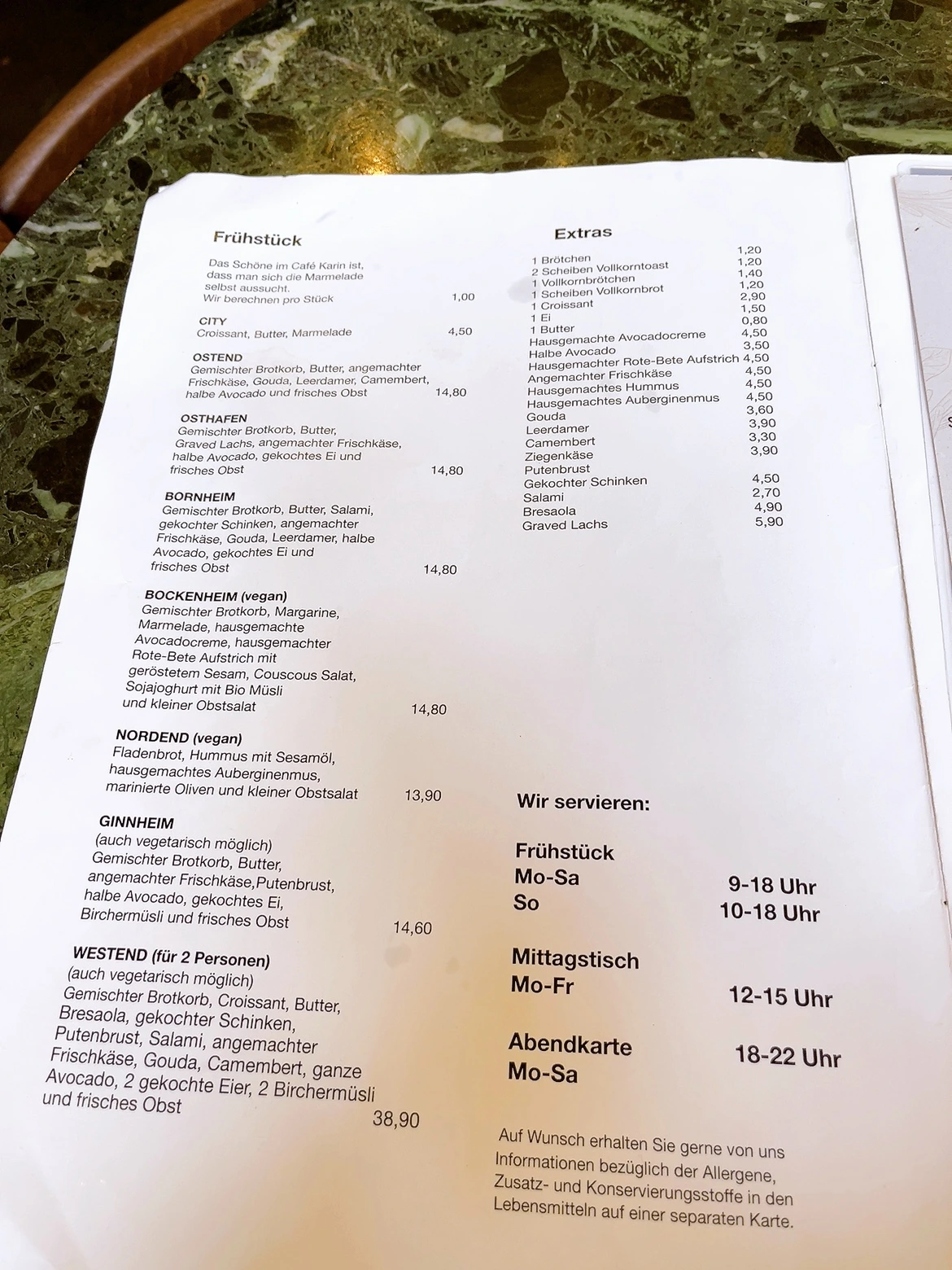 유로타워에서 10분 정도 걸어가면 괴테하우스 건너편 코너에 ‘카페 카린’이라고 하는 괜찮은 브런치 레스토랑이 나온다. 난 메뉴를 보며 궁리를 하다가 점원에게 추천메뉴를 알려달라 했고 아보카도와 연어 계란반숙 등의 모닝세트를 먹었다. 세가지 종류의 빵과 곁들여 먹는 석류가 토핑된 크림치즈가 맛있었다. 속엔 잘게 썰린 양파가 들어있어서 풍미를 돋웠다.