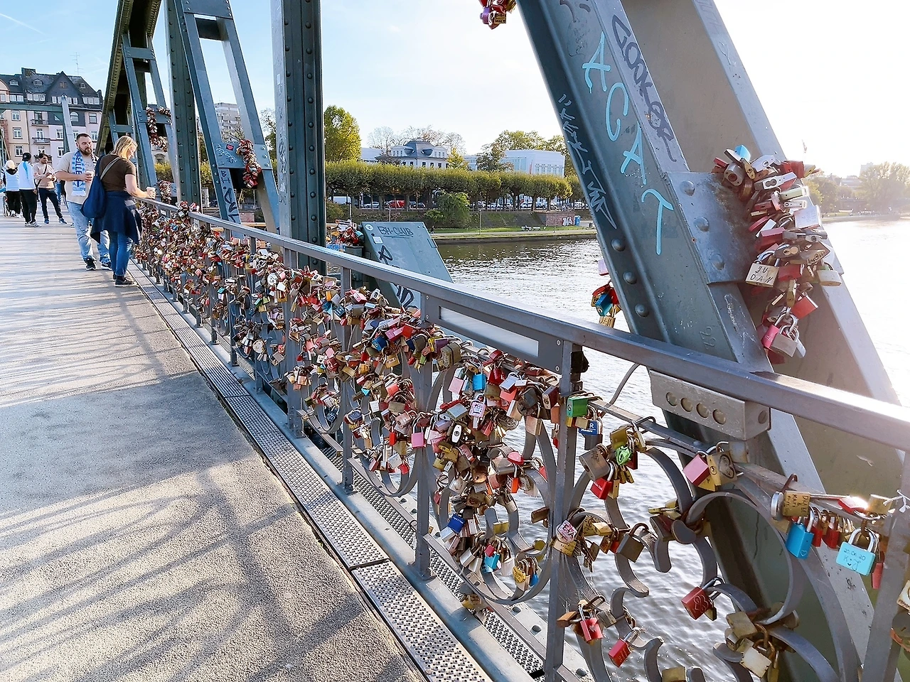 아이젤너다리는 라인강의 지류인 마인강이 뢰머광장이 있는 강 윗쪽과 아펠바인으로 유명한 지역인 작센하우젠 지역을 가른다. 크게 발달한 도시는 강을 중간에 끼고 있는 공통점이 있는데 파리나 서울과도 비슷한 구조이다. 이곳 난간에는 사랑의 자물쇠가 주렁주렁 달려 있는데, 행복에 푹 빠져있는 젊은 연인들이 서로 끌어 안고 있는 모습을 곳곳에서 볼 수 있어서 로맨틱한 분위기를 낸다.