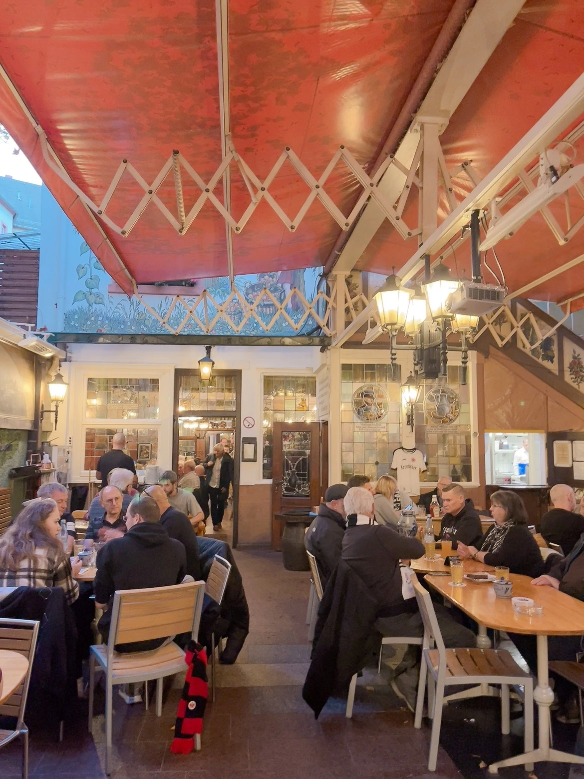 겨우 찾아서 도착한 아돌프 바그너에 들어서자 마자 이내 판단을 잘못한 것을 알았다. 그곳은 거의 시골 장터 느낌으로 왁자지껄하고, 혼자 온 손님이 따로 앉을 자리를 마련하기엔 역부족으로 보였다. 카운터 근처에서 서 있었지만 점원은 ‘잠시만!’이라고 말은 해도 밀린 주문을 처리하고 아펠바인 항아리에 술을 담기 바빴다. 나는 약간 마음이 상할 뻔 했는데, 예약을 미리 하지 못한 내 탓도 있었다. 주문을 해도 언제 먹을 수 있을까 싶은 상황. 그리고 혼이 쏙 빠지도록 단체 손님으로 발 디딜 틈이 없는데다 손님들이 여기 저기서 노래를 부르고 술잔을 부딪히는 와중에 패닉인 점원들의 넋 나간 표정을 보니 여력이 안된다는 게 이해가 됐다. 다시 살아난 나의 인류애를 축복한다.