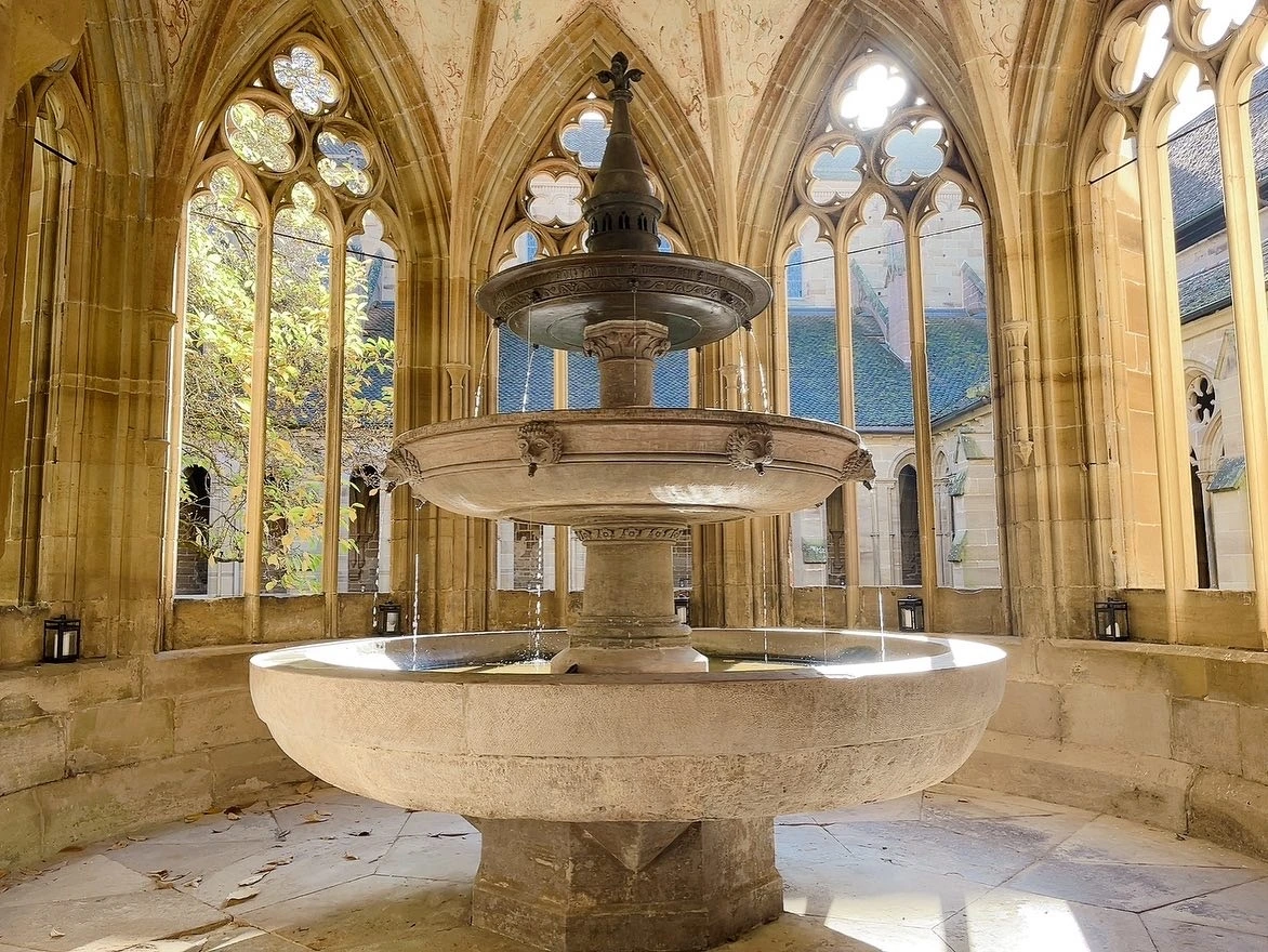 사진에서 보던 그 전경이 눈앞에 나타나자 한동안은 믿을 수 없어서 가만히 적응이 될 때까지 바라보았다. 낙엽이 지고 있는 나무 아래에는 두 명의 여성이 행복한 미소로 서있었다. 나는 낙엽 하나를 주워 훗날 추억하기 위해 리플릿 사이에 끼웠다. 다각형 건물이 하나 돌출되어 있는데 마울브론 수도원이 생기게 된 이유인 지하수가 나오는 곳, 분수대이다. 맑은 물소리가 흐르는데 중정과 수도원 곳곳을 가득 채우며 청정한 기운을 더했다.
