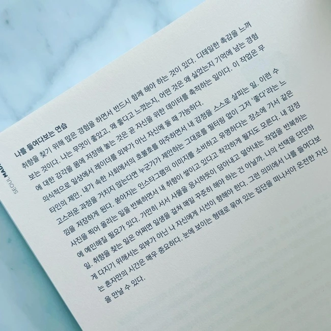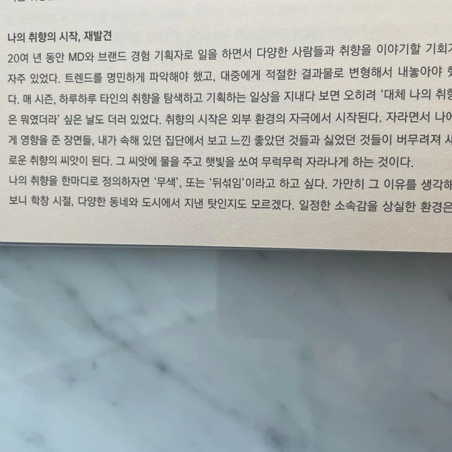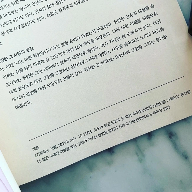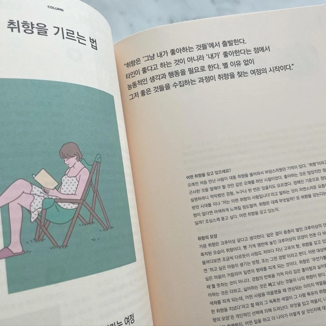 "취향은 '그냥 내가 좋아하는 것들'에서 출발한다. 타인이 좋다고 하는 것이 아니라 '내가' 좋아한다는 점에서 능동적인 생각과 행동을 필요로 한다. 별 이유 없이 그저 좋은 것들을 수집하는 과정이 취향을 찾는 여정의 시작이다.
