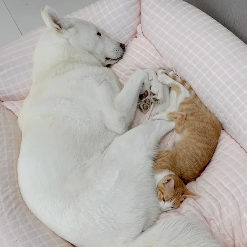 바로, 금순이라는 고양이가 함께 살고 있다는 건데요. 같이 살고만 있다면 그리 특별하지 않을 수 있지만, 둘은 서로를 아끼는 게 눈에 보일 정도로 사이가 좋습니다. 고양이와 강아지가 원수지간이라는 말이 무색하게요.