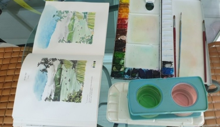그리고 나는 지금 색 싸인펜을 놓고 다시 물감과 빠레트를 잡았다. 내가 명암을 넣는 것이 서툴러서 딸에게 도움을 청했을 때 95년생 딸이 말하기를 기초를 가르쳐 주는 영상강의를 찾아서 배워야 한다고 조언했다. 그때는 아프게 들렸는데 기초가 부족함을 느끼고 정말 기초부터 다시 배우기 위해서였다. 뭐 하나 배워서 금방 되는 손기술이 아니란 뜻이겠지. 수채화 기본 교본을 놓고 색을 만들고 물을 섞으면서 초등학교 때 처음 잡았던 수채화를 다시 시작하는 기분이다. 수채화 교본을 보며 조금씩 원본의 그림과 비슷해지는 데 소소한 기쁨을 느끼며 나는 오늘도 1일 1 그림을 내 인스타그램에 포스팅하고 있다. 나와 같이 손그림을 올리기 시작한 이웃과 서로 피드백을 주고 응원하면서~~