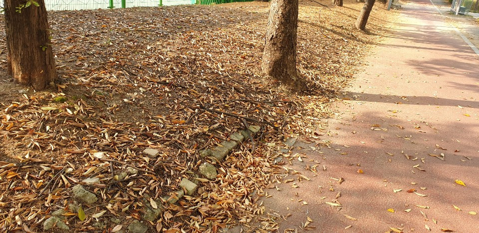 길에 인접해 있는 주민스포츠센터는 휴업이지만 그 옆 운동장에서 가끔 조기축구회를 하는 남자들의 힘 있는 목소리가 담장을 넘는 걸 보니 실외 스포츠는 코로나 위기를 버티고 있는 것 같다. 여기서 노년의 커플이 애틋하게 작별을 하고 있더라고 동네 친구가 전해 준 뒤부터는 인적이 많지 않은 이 오붓한 길이 왠지 낭만적으로 보이기도 한다. 낙엽이 제법 쌓인 거리를 걷다가 몇 컷 찍어 보기로 했다. 그런데 꼭 찍으려고 하면 누군가 앞에서 나타난다. 아무래도 구도 좋은 사진 찍기는 틀려 먹었다!