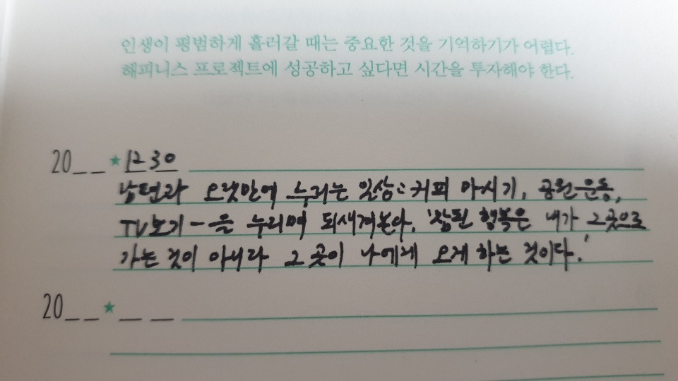 남편과 오붓하게 TV 드라마를 보고 늦은 아침 공원 산책을 할 때, 퇴근하고 가공식품이 아닌 건강식 자연밥상을 차릴 때, 설거지를 마친 남편이 차받침도 없이 그 뜨거운 차를 들고 와서 내 손가락에 건네주는 막 추출한 원두커피의 향이 나를 행복하게 한다. 날마다 나를 재촉하던 메신저도 출퇴근의 다급한 가슴두근거림도 없다. 대신에 하고 싶은 공부와 읽고 싶은 책을 쌓아놓고 내 마음대로 24시간을 설계할 수 있는 지금이 나는 너무 행복하다. 뒤도 못 돌아보고 워킹맘으로만 살았던 지난 26년 동안 감히 꺼내보지도 못한 나의 작은 꿈들을 꺼내 놓고 하나씩 버킷리스트를 채워가는 지금이 두 아이의 엄마로 살았던 지난 날보다 더 행복하다면 나는 이기적인 사람인가? 나는 행복을 기다리고만 있지 않기로 했다!