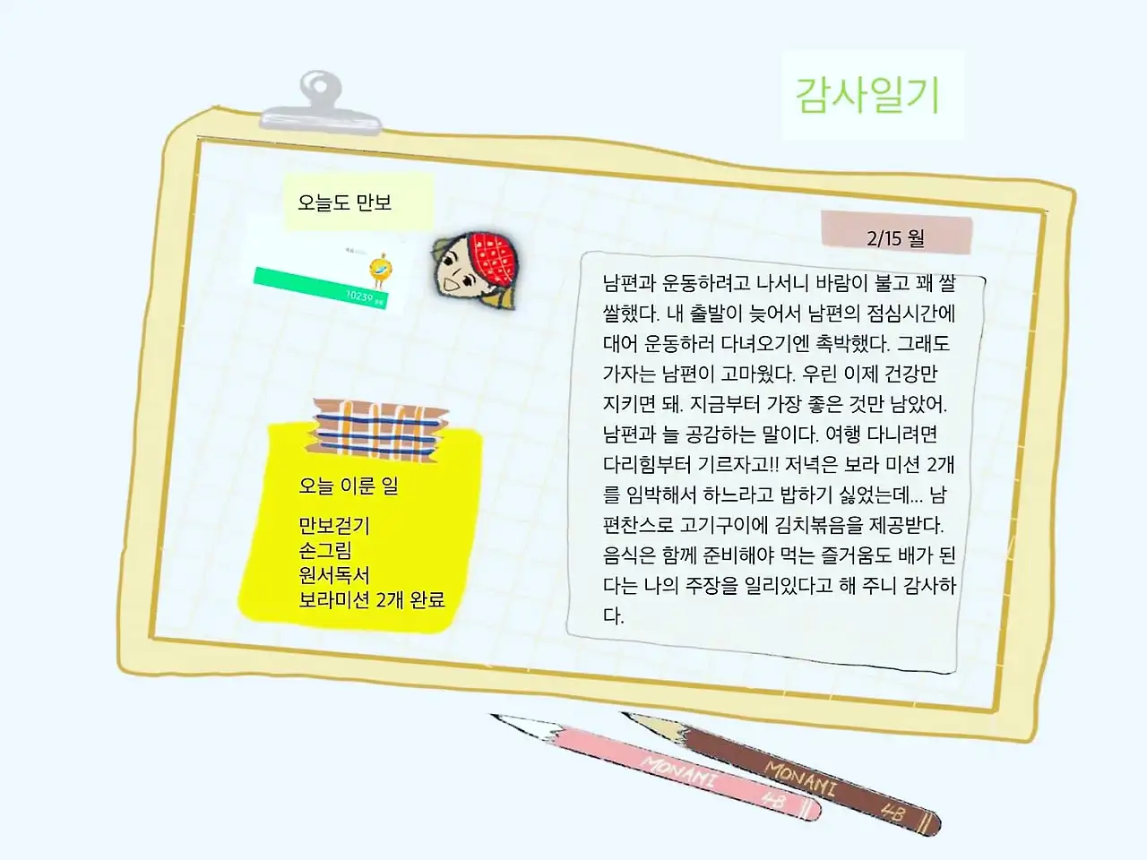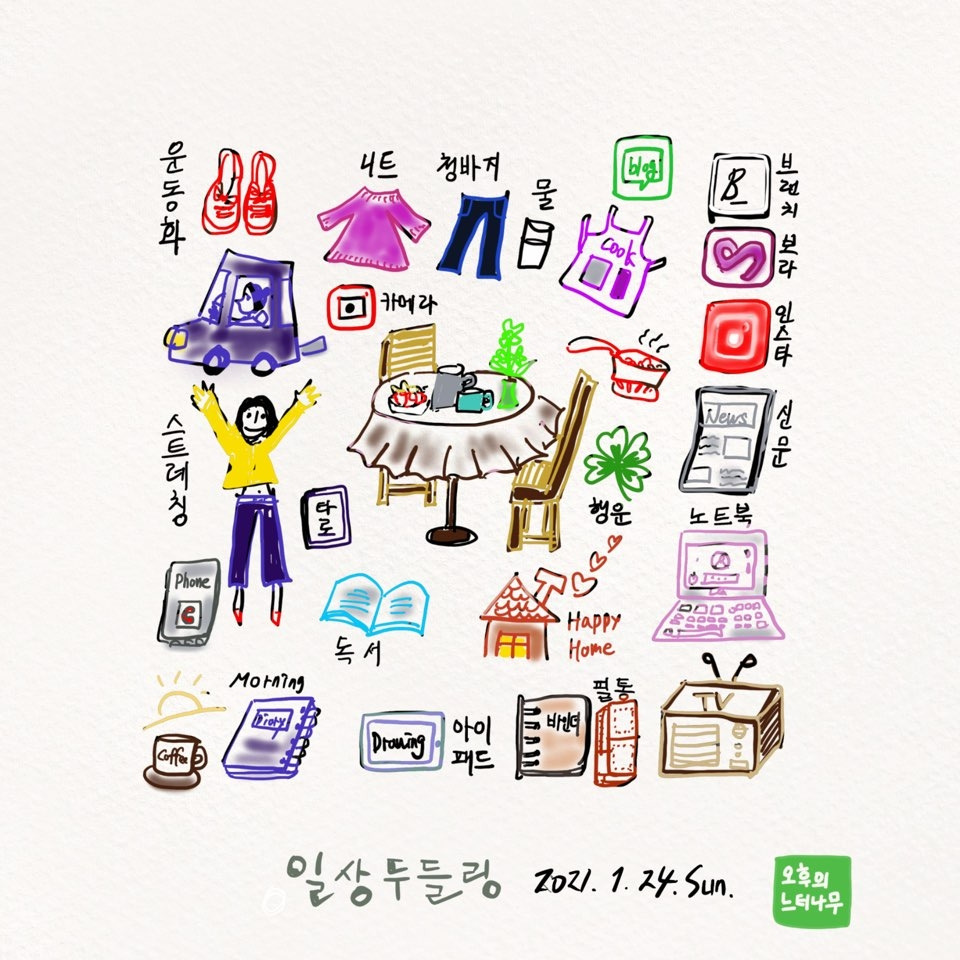 그렇게 그다음 달에 1일 1 그림을 시작하고 2개월 동안 손그림을 매일 인증했다. 의외로 기분이 괜찮았다. 아침 설거지를 마치고 청소까지 한 다음 오전 10시쯤에 그림을 그렸다. 색연필 몇 자루를 아이들 책상 서랍에서 찾아와서 무지 공책까지 하나 주워다가 어설픈 손그림을 시작했다. 딸아이가 사놓은 일러스트 책을 가져와서 따라가 보는 것도 나쁘지 않았다. 그러다가 디지털 그림에 눈을 떴다.
