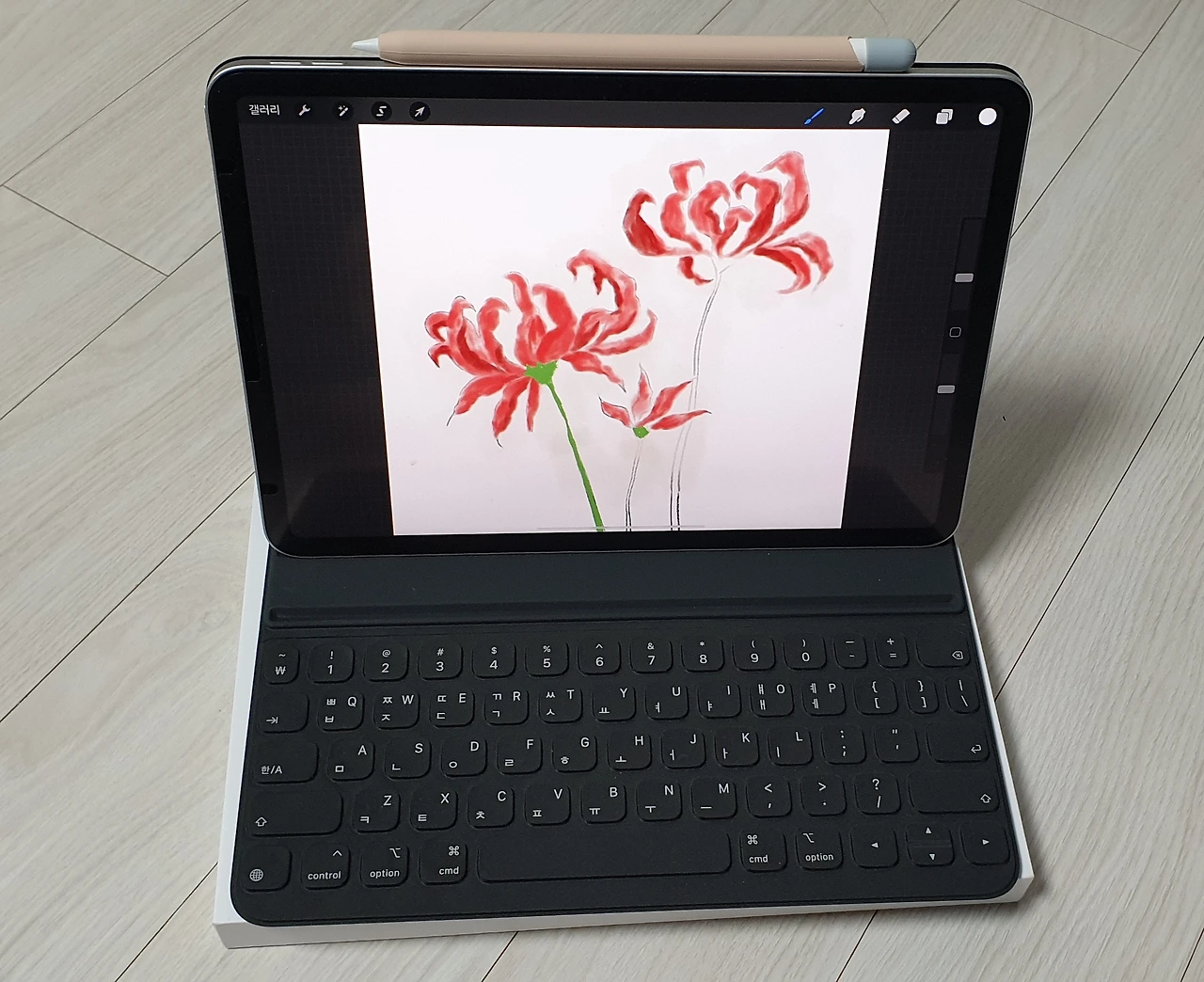 그중에 가장 부끄러운 것은 아이패드 펜슬의 정확한 충전 지점이 어딘지 잘 몰랐다는 것과 충전여부를 어떻게 확인해야 하는지도 몰라서 갑자기 펜슬에서 잉크가 나오지 않으면 어쩔 줄 모르고 답답했다는 것. 펜슬 사용만되도록 환경설정에서 세팅해 두면 손이 닿은 얼룩이 생기지 않는다 는 것도 몰랐다. 완성된 그림에 얼룩이 생긴 것을 두고 속상해서 쩔쩔매기도 했다. 손을 대지 않으려고 애쓰다 보니 종이에 그림 그리기보다 더 힘이들었다.