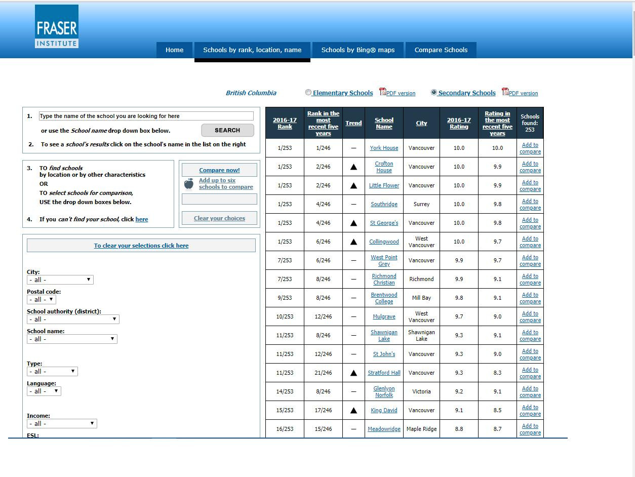 현지인 친구들에 의하면 이것들은 정말 무의미한 데이터라더라. 그들에 따르면 근거도 없고, 시험도 그냥 아무나 보기 때문에 신빙성도 없다고. 하지만 아시아인들에게 그런 게 쉽게 귀에 잘 들어올 일 없다. 그것보다 숫자가 더 눈에 콕콕 와서 박힌다. 그리고 명성은 물론이거니와 여러 요소로 명문을 가리고, 그 명문으로 정말 많은 학생들이 몰린다. 반대는? 반대인 학교에는 상대적으로 현지인들이 좀 많더라. 캐나다에서 좀 더 오래 거주한 현지인을 만나고 싶으면 데이터와 반대로 움직이라고 하고 싶다. (또 한편으론 '아무도 이렇게 랭킹을 만드는 것에 대한 반발을 하지 않는단 말이야?'라는 생각이 들기도 했다. 초등학교까지 싹 다 비교해놨는데, 한국이었으면 이게 가능했을까 생각이 들었다.)