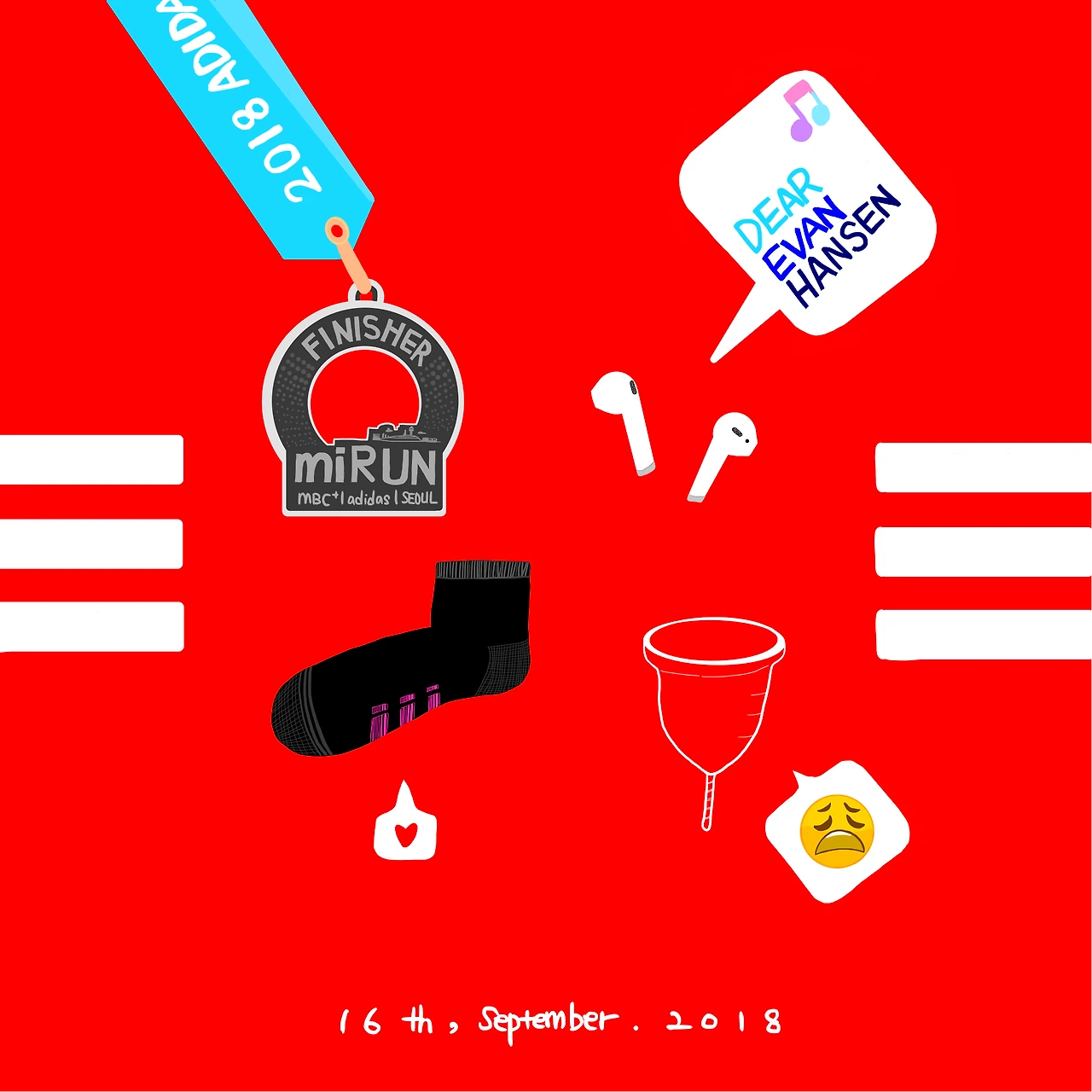 어제까지만 해도 아디다스가 이해되지 않았다. 많이 내리지는 않지만 비가 내린다잖아. 어서 취소 문자를 보내! 폰을 붙잡고 있어봤자 바뀌는 건 없었다. 나는 5만 원을 냈고, 가야 했다. 하지만 꼭 가야 할까? 일단 기념품은 받았으니까 5만 원 정도 대충 퉁쳤다고 쳐도 되지 않나? 아니, 아니었다. 말도 안 되는 빨강 티셔츠에 홑겹 가방에 5만 원을 썼다고 생각하면 피눈물이 날 것 같았다. 그래, 가자. 집에서 여의도공원까지 1시간 40분이 걸리는데 아무리 늦어도 7시 10분까지는 가야 하는 걸 아는 친구가 마포구청역 새집에 와서 자고 가라고 했다. 하지만 기다린 것처럼, 예정일보다 일찍, 마치 마라톤 날에 생리 둘째 날을 맞추기 위해 계획이라도 한 것처럼 새로운 주기를 시작하기 위해 몸이 자궁벽을 허물기 시작했고, 나는 친구네 쇼파에서 자는 대신 집으로 돌아오는 걸 택했다. 당연히 12시에 잠이 올리 없으니까 축구를 보며 그림을 그리는 사이 1시가 되고, 2시가 되고... 잔 것도 안 잔 것도 아닌 채로 3시간 정도 침대에 누워있다 보니 알람이 울렸다. 와, 진짜야? 이대로 가야 돼? 정말 믿기지 않지만 가야지 어떡해.