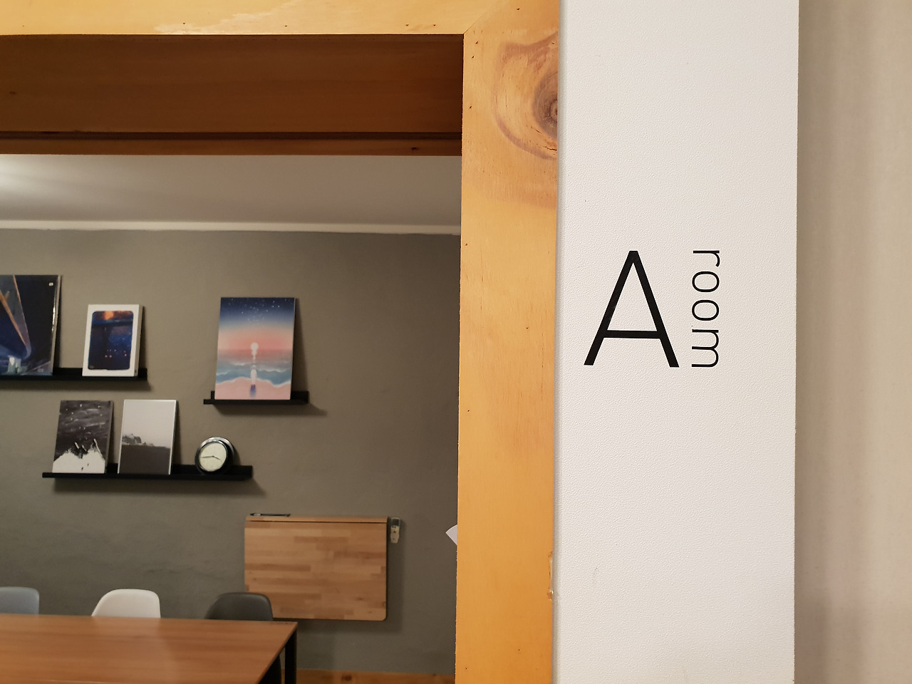 A room은 최대 16인까지 이용이 가능한 넓은 공간이다. B room과 다르게 아예 밖으로 통하는 창문이 있어서 조금 더 통풍이 잘 되는 느낌이었고, 여백 공간에는 차분한 색감의 일러스트를 배치하여 전체적으로 심플하고, 모던한 분위기가 연출되었다. 이곳은 주로 클래스나 세미나가 진행되기에 적합한 공간이다.
