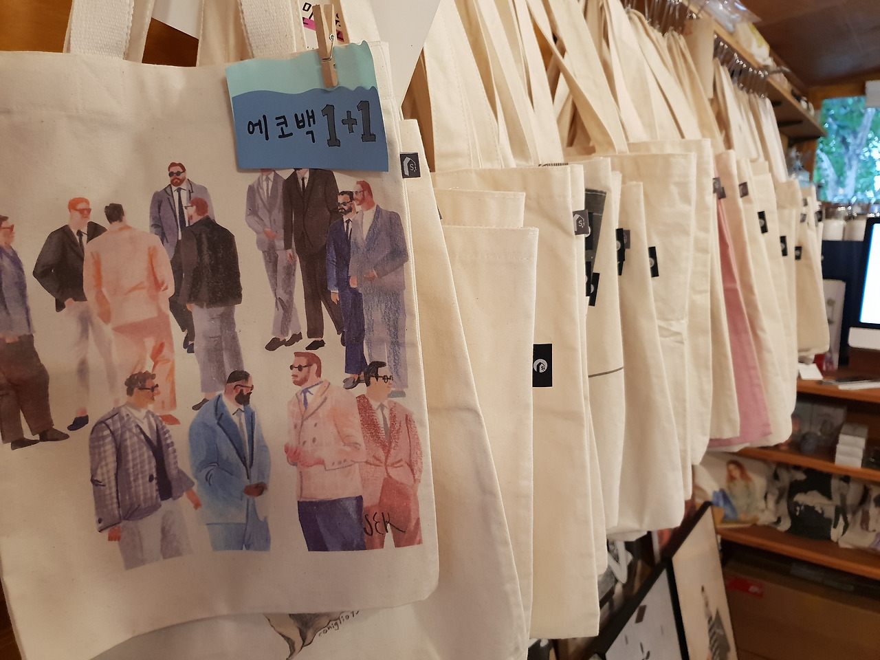스튜디오썸띵 1층은 온전히 아트작품으로 구성된 공간이다. 아기자기한 일러스트가 담긴 엽서부터 큰 액자 그림, 정갈하게 놓인 책, 꽤 마음에 들었던 에코백까지 사방을 둘러싼 아트작품을 감상하느라 시간 가는 줄 몰랐다.