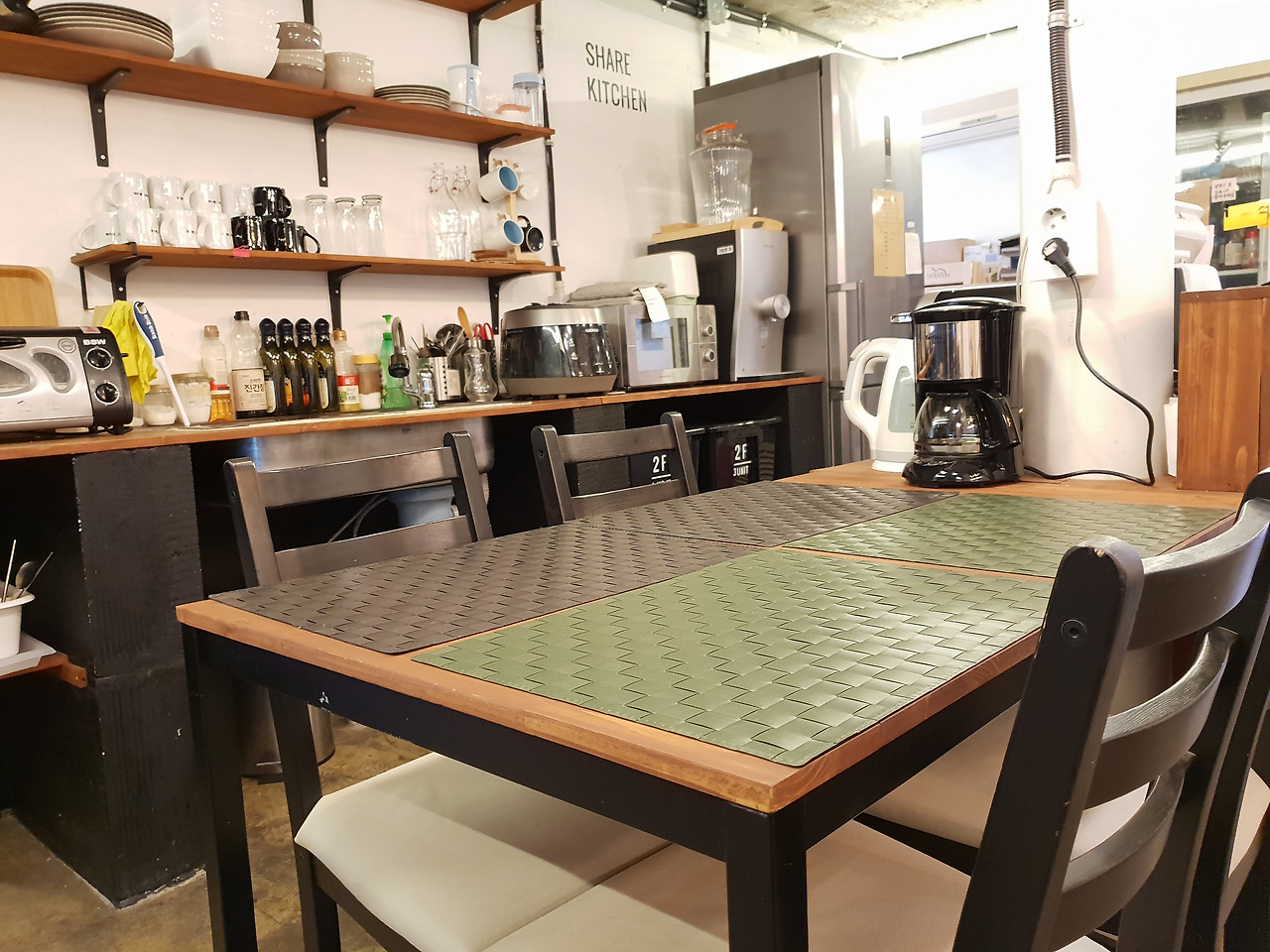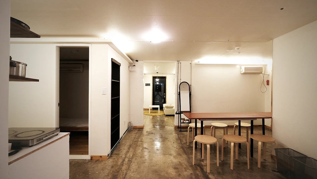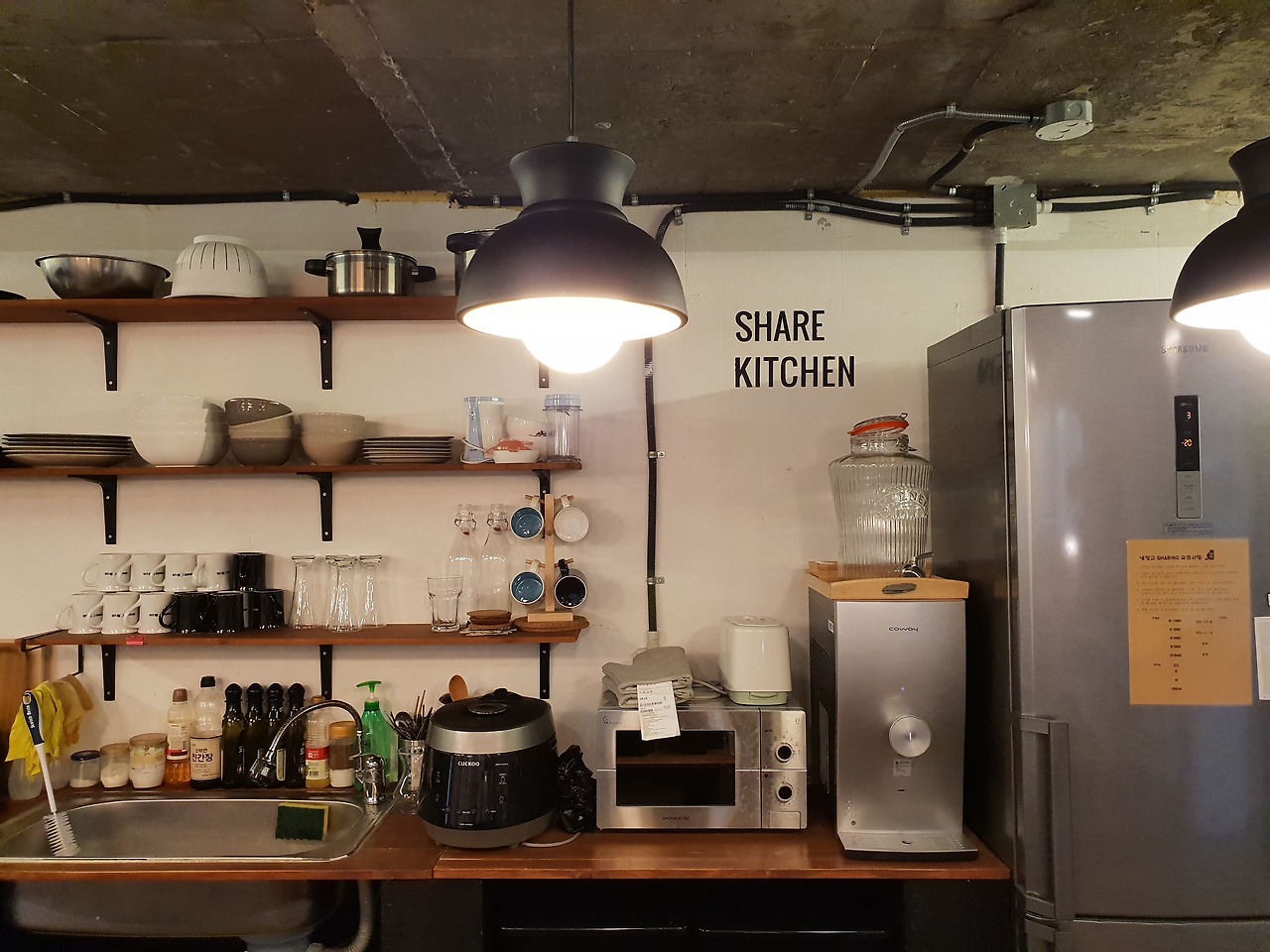 우선, 가장 큰 변화는 방을 대폭 줄였다는 점이에요. 44개의 방을 19개로 줄였여요. 방을 제외한 나머지 공간은 최대한 공유공간으로 만들려고 했어요. 1층 역시 원래는 방으로 가득 차있었는데 지금은 '커뮤니티 라운지'와 입주사 사무실 공간이 조성되었죠. 1층에는 공유주방도 있는데 2,3,4층에는 주방이 없어서 여기서 다 같이 사용하는 공간이에요.