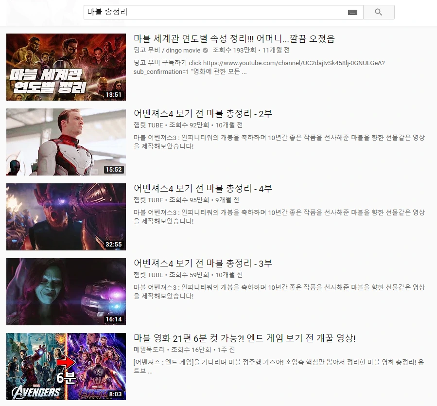 유튜브의 ‘마블’ 연관 검색어를 살펴보면 ‘마블 총정리’, ‘마블 세계관’, ‘마블 정리’ 등의 키워드를 확인할 수 있다. 그만큼 많은 사람들이 유튜브를 통해 마블의 정보를 얻는다는 것이다. 이는 마블 슈퍼히어로 영화에 입문하는 사람들뿐만 아니라 오랜만에 보려고 하니 잘 기억이 안 나서 보는 사람들도 있고, 아니면 좀 더 풍성하게 관람하기 위해 정보를 모으려는 사람들도 있다.