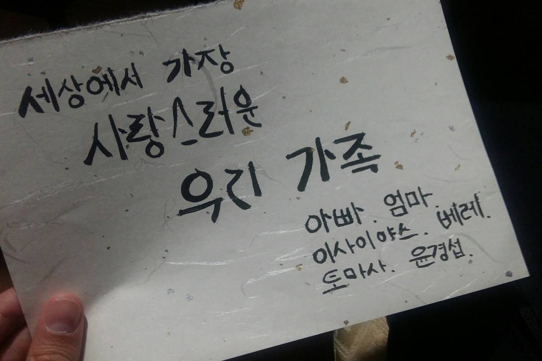 제 이름을 써서 주는 건 선물이라고 할 수 없잖아요. 하하. 외국인 친구의 이름을 한글로 적어줍니다. 그 밑에 제 이름을 도장처럼 남기는 거죠.