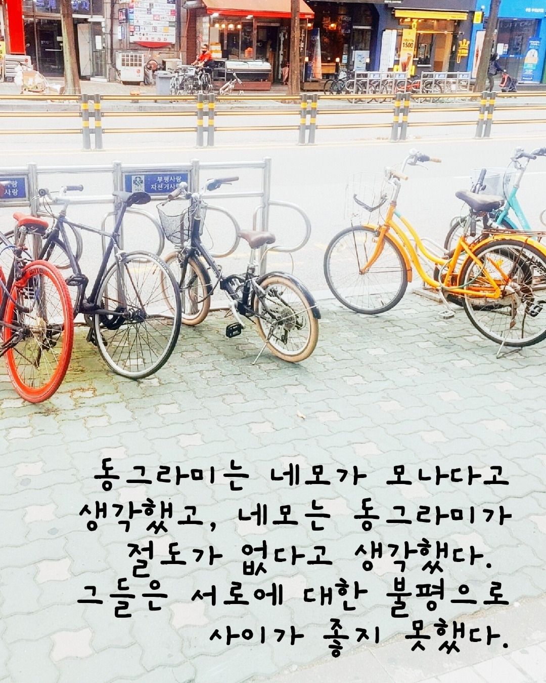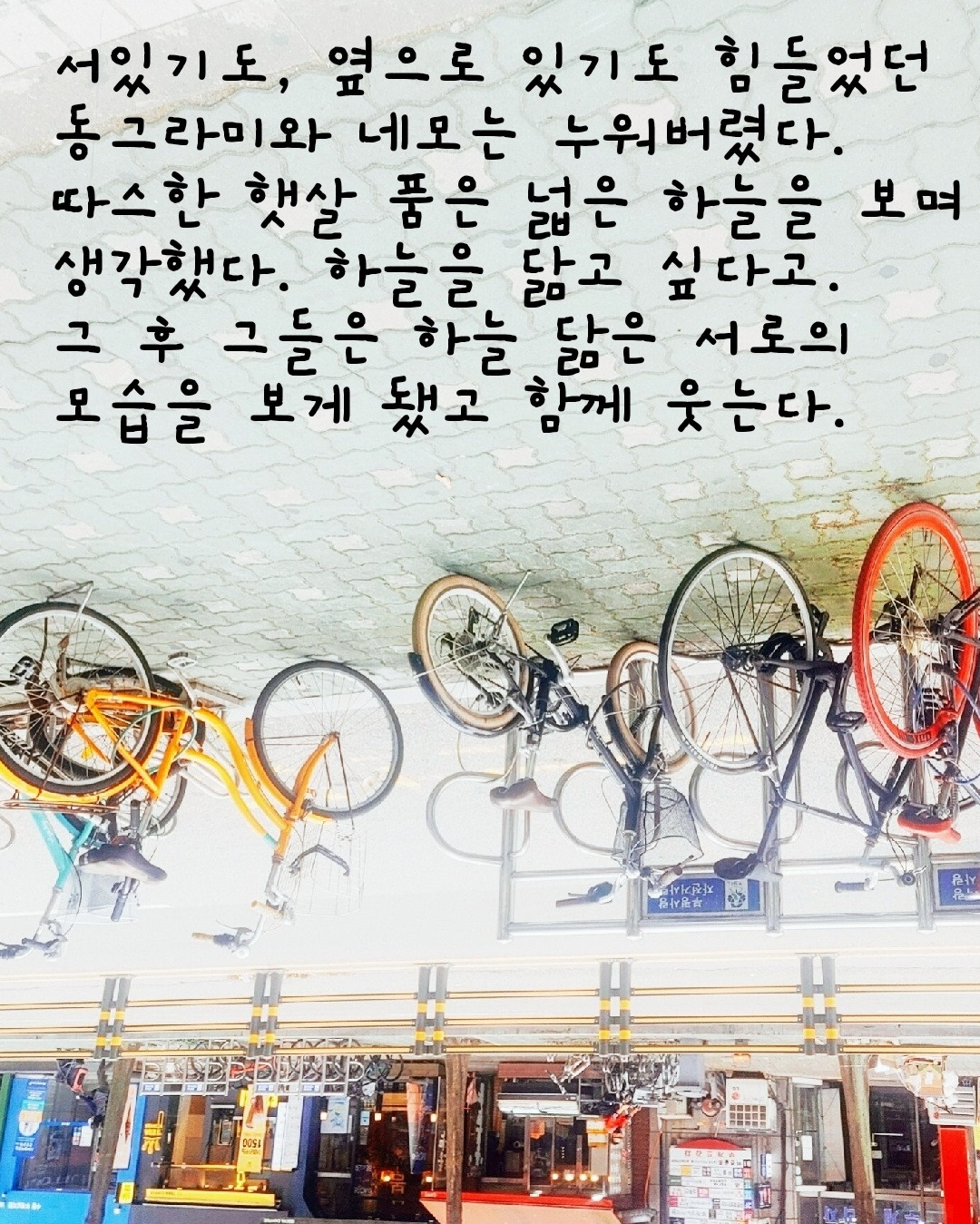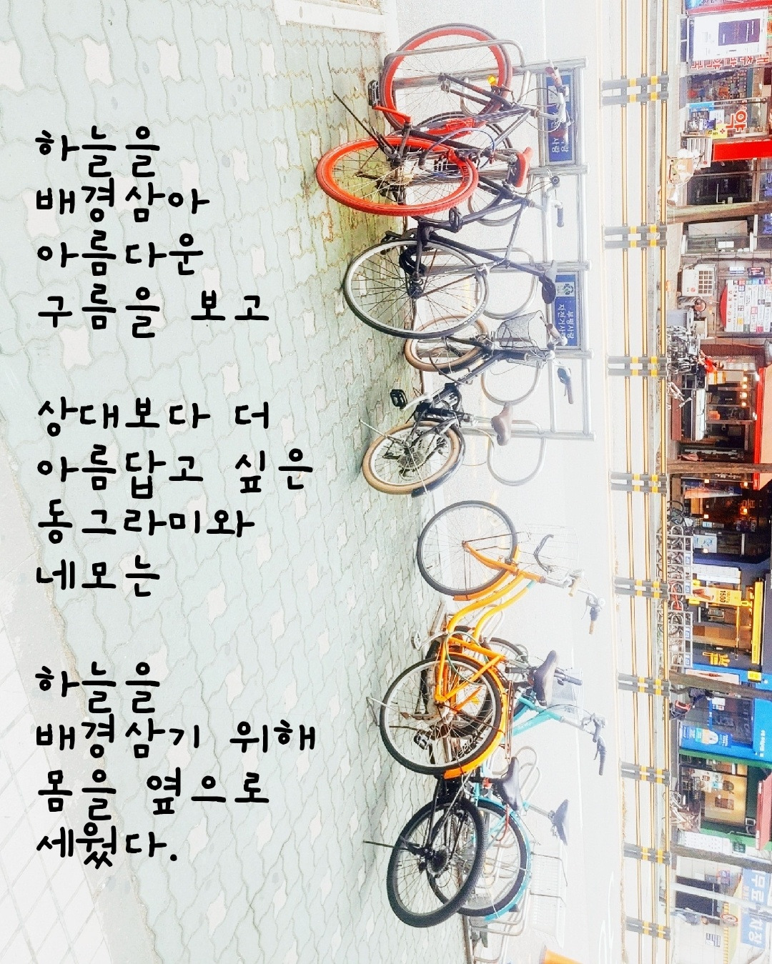 어제는 빨간색, 검은색, 노란색, 하늘색, 색색이 어우러진 자전거 풍경이 예뻐서 사진을 찍었다. 찍고 보니 건너편 건물들의 색도 예쁘다. 건물의 네모와 자전거의 동그라미를 보며 상상을 해 봤다.