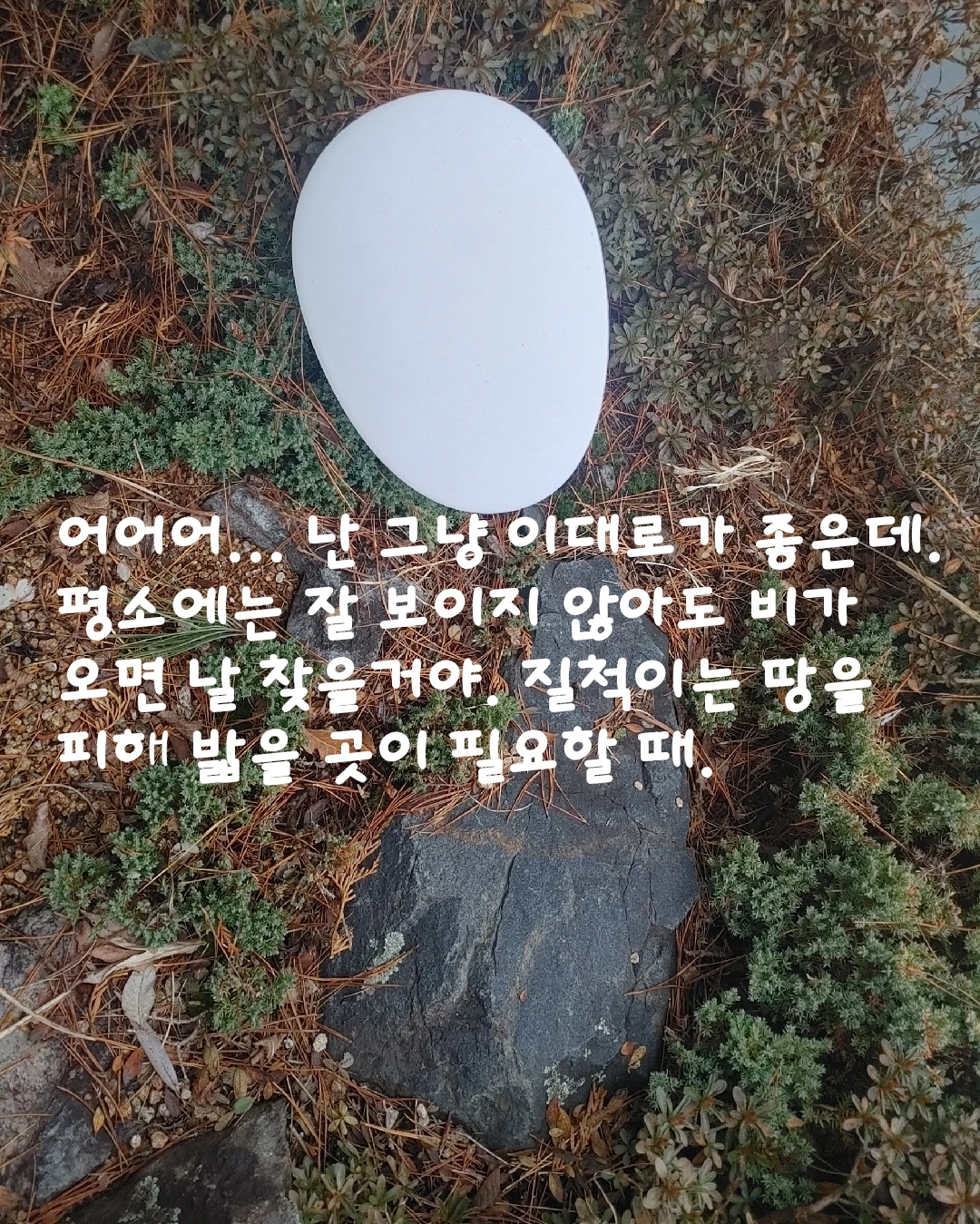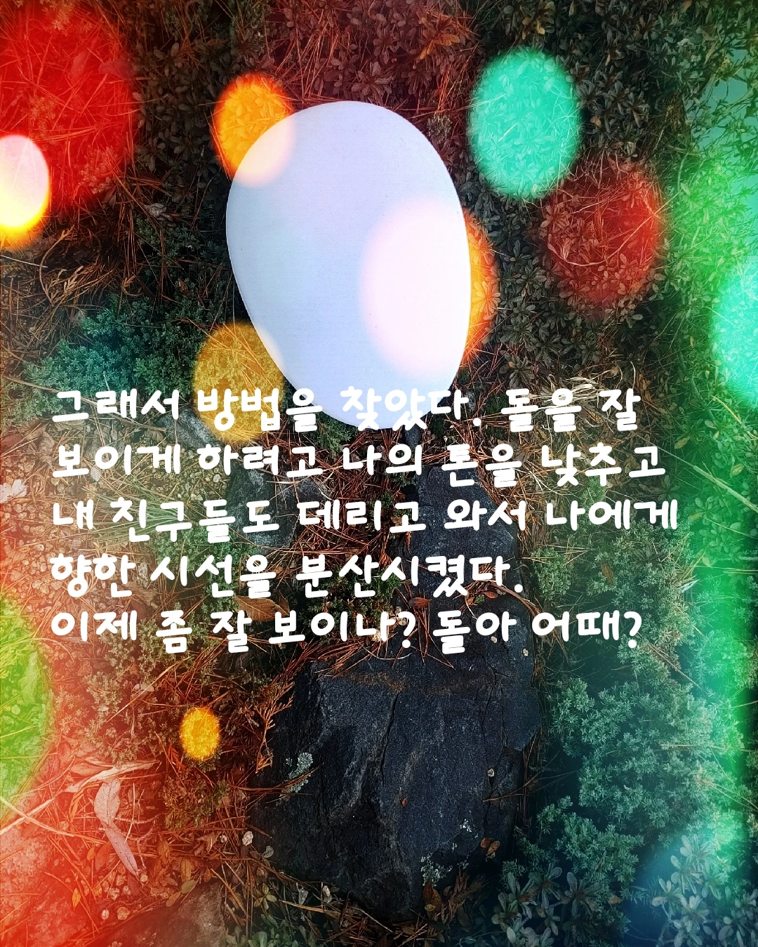 달걀모양의 하양이가 그곳에 옮겨졌을 때 옆에 돌이 있는 줄도 몰랐다. 하양이는 커다란 모습이 금방 눈에 뜨여서 사람들의 관심을 받았다. 관심을 받다 보면 맘 상하는 일도 많고 웃을 일도 많다. 하양이는 마음을 그대로 드러낸다. 깔깔거리며 웃기도 하고 엉엉 소리 내어 울기도 한다. 처음엔 잘 몰랐는데 어느 순간 혼자가 아닌 거 같은 생각이 들었다. 웃으면 더 경쾌한 소리가 나고, 울면 그 눈물이 어딘가 그대로 흡수되는 느낌이었다. 그래서 옆을 봤고 그제야 돌이 있었다는 걸 알았다. 그렇게 돌과 친구가 된 하양이는 뭔가를 요구하지도 못하고, 큰 소리를 내거나 불평하지도 않는 돌이 좀 답답했다. 그런데 이제 하양이는 돌이 얼마나 멋진 친구인지 안다. 그래서 자랑하고 싶다.