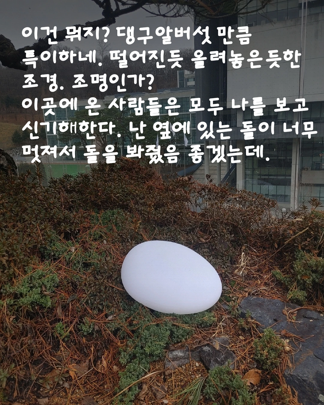 어제 카페에 갔다가 옥탑에 있는 달걀모양의 흰색 조형물을 봤다. 어떤 용도인지는 잘 모르지만 그 조형물과 그 옆의 돌을 보면서 이런 상상을 했다.