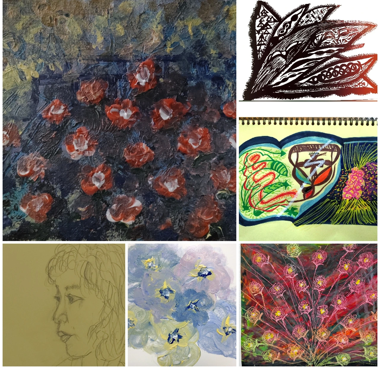 그림의 제목은 '삶 담은 얼굴'이다. 이것도 처음부터 이런 걸 그리려고 의도한 것은 아니다. 뭐 그리고 싶냐고 혼잣말로 중얼거리면서 이것, 저것 생각나는 대로 그렸다. 처음 시작은 물고기 모양이었는데 안에 동그라미를 넣었다가 눈이 되는 그런 식이다.