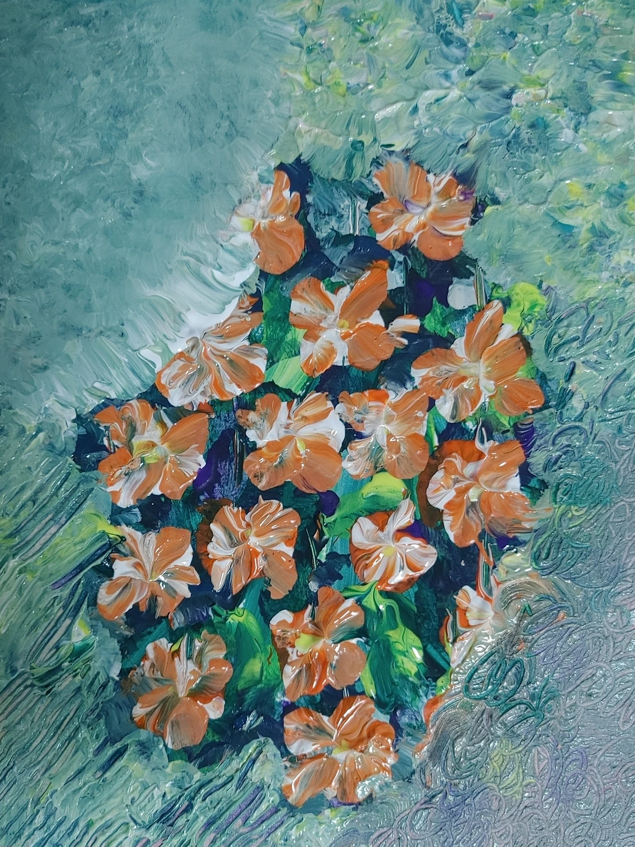 새롭게 시작하는 아이들을 생각하며 꽃을 그렸다. 사방에서 각기 다른 어려움들이 꽃을 잠식하지만 여전히 어름다운 꽃을 표현한 그림이다.