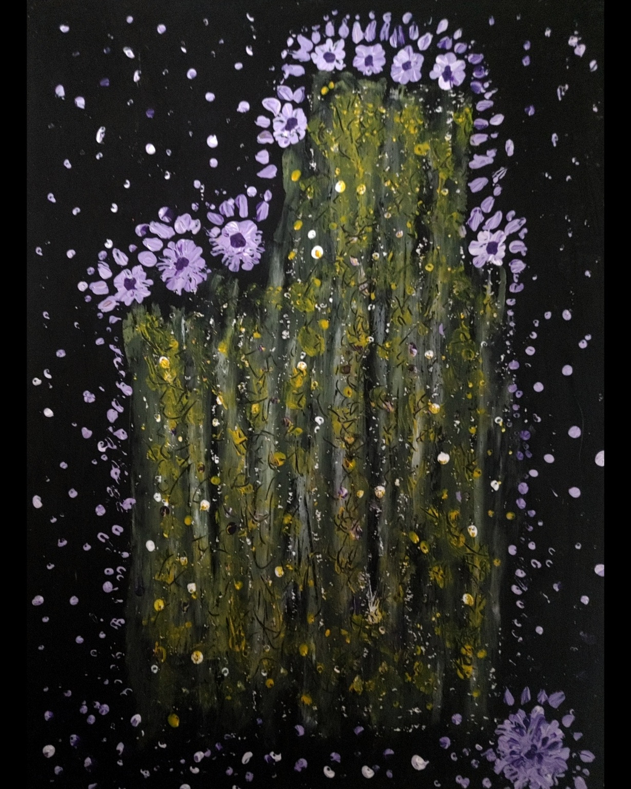 그림은 선인장 주위에 밝게 빛나는 꽃이다.