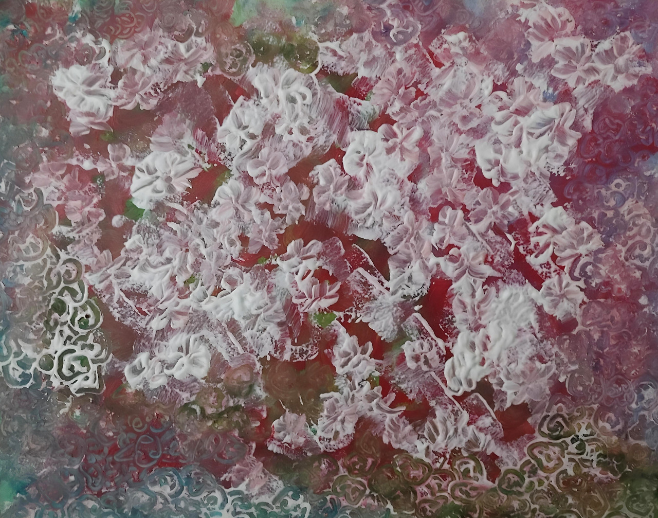 오일 파스텔로 파란색 계열, 초록색 계열, 보라색 계열로 나누어 칠하고, 그 위에 듬성듬성 분홍립스틱을 칠했다. 흰색 아크릴 물감으로 제대로 형태를 갖추지 않은 꽃을 그리고, 주위를 펜으로 동글동글하게 무늬를 넣어 마무리했다.