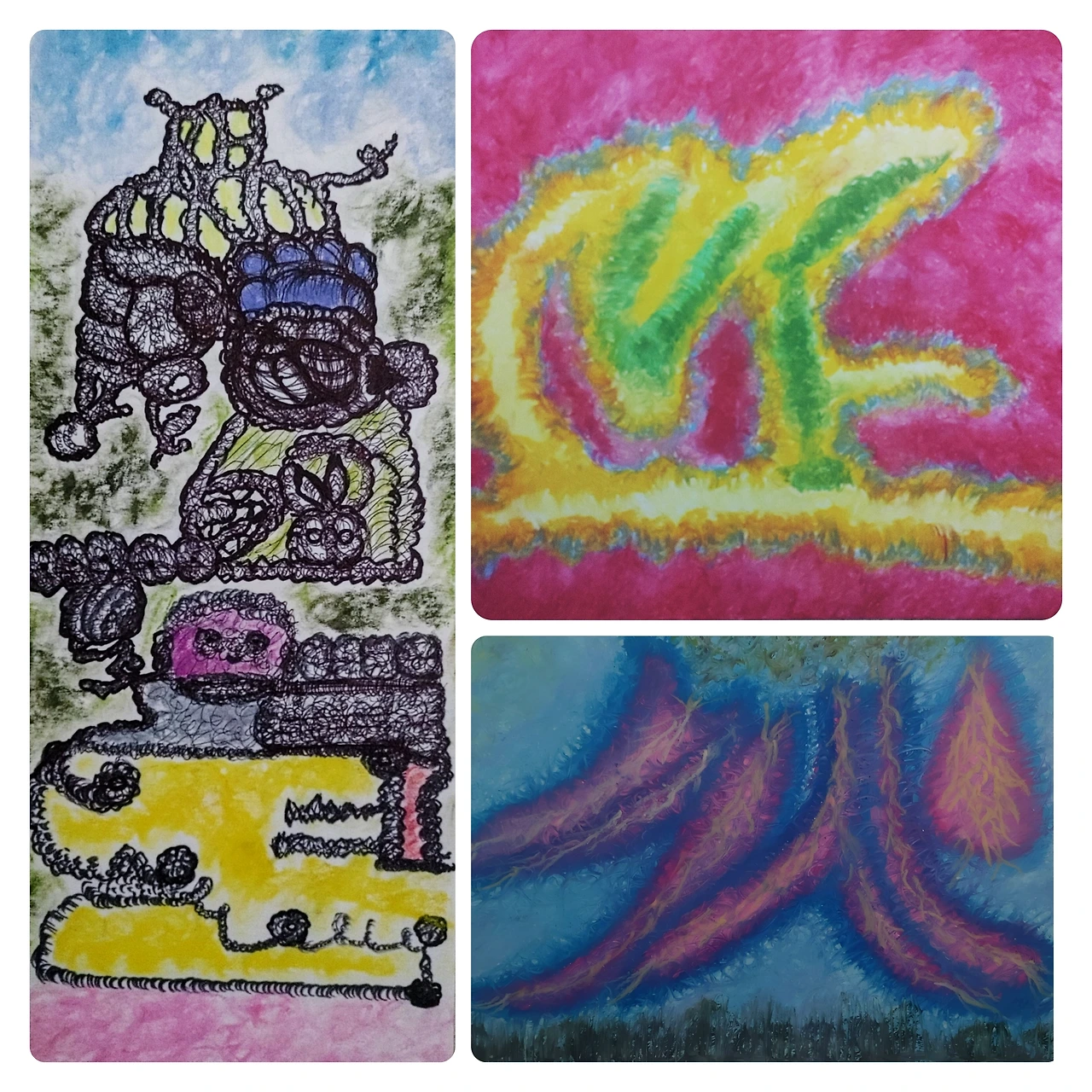 왼쪽에 보이는 것은 택배 보내려고 낙서한 것 위에 심심해서 볼펜으로 그 틈을 메우다가 그리게 됐다. 그리고 오른쪽에 보이는 두 개의 그림은 나도 뭘 그렸는지 모르지만 뭔가 강력한 에너지를 표현하고 싶었다. 강력한 에너지를 표현하고 싶었을 때, 그 에너지는 열정이기도 했고, 분노이기도 했다.