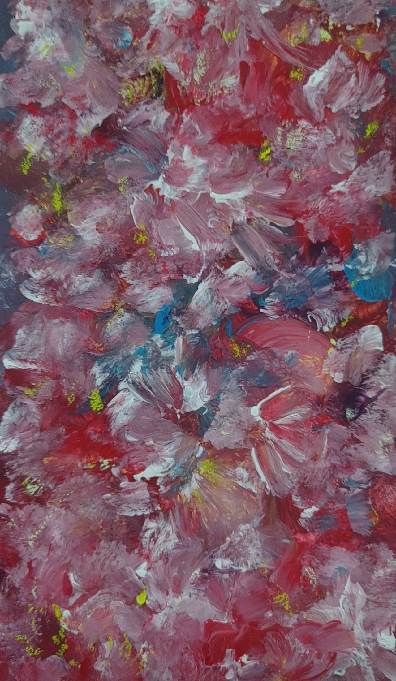 붉은색과 보라색을 중심으로 한 강렬한 색조 속에서, 연둣빛의 점들이 생명력과 희망의 상징처럼 자리 잡고 있다.