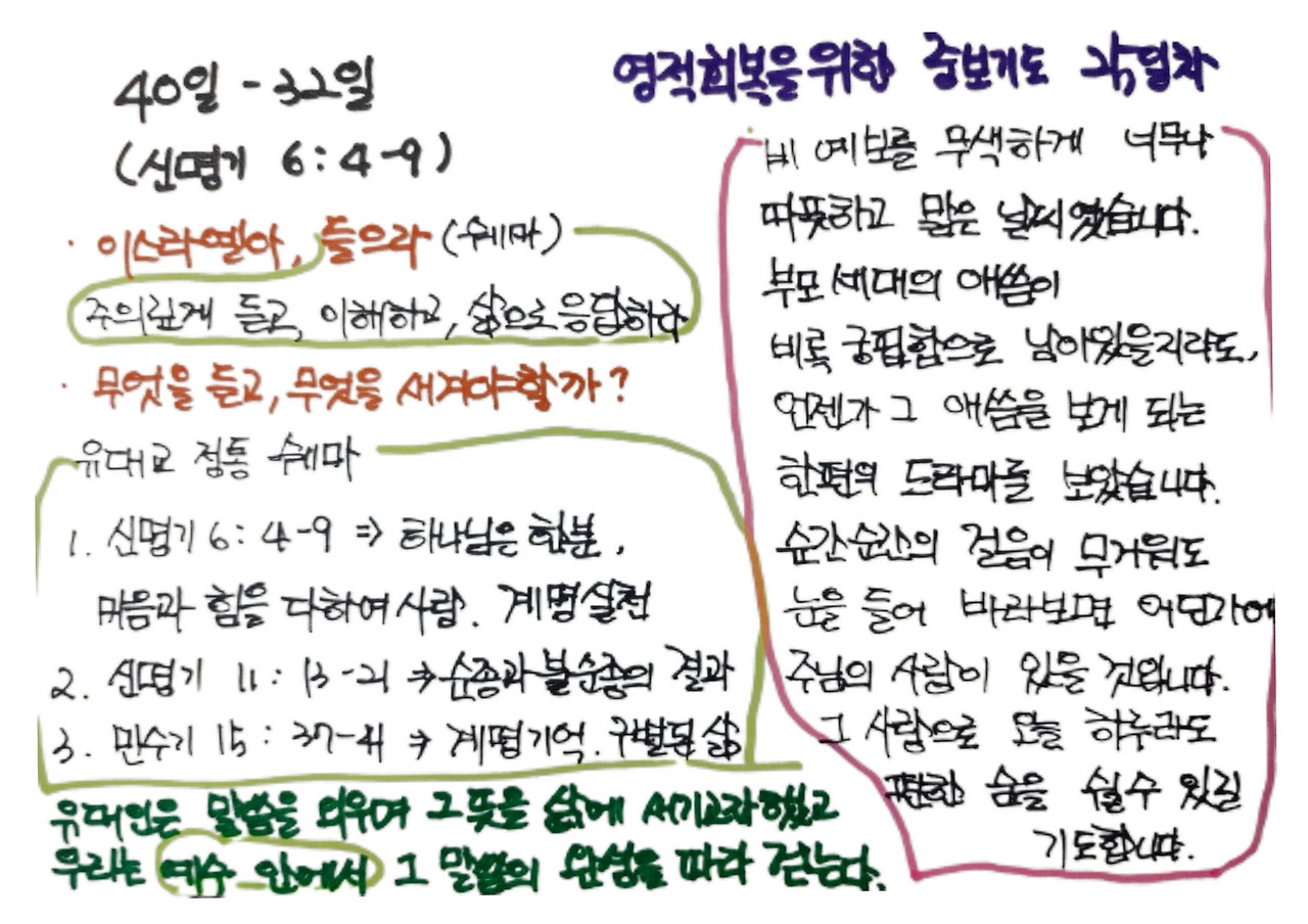 아침과 저녁으로 쉐마를 외우는 유대인들의 삶을 떠올려 보았습니다. 그들은 매일같이 그 말씀을 입에 담으며, 그 뜻을 마음에 새기고, 삶에 새기고자 했을 것입니다.