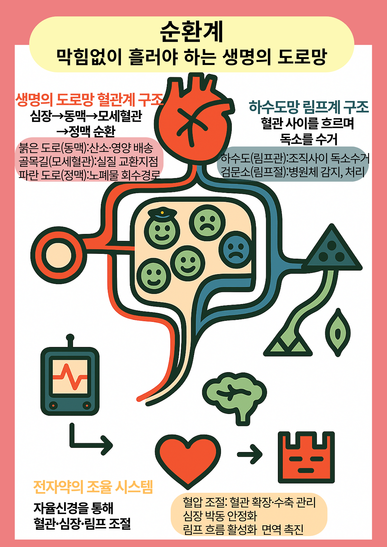 이 순환이 원활해야만, 100조의 시민들이 건강하게 살아가고, 도시도 막힘 없이 기능할 수 있습니다. 교통체증이 생기면 피로, 부종, 질병이라는 경고등이 켜지게 됩니다.