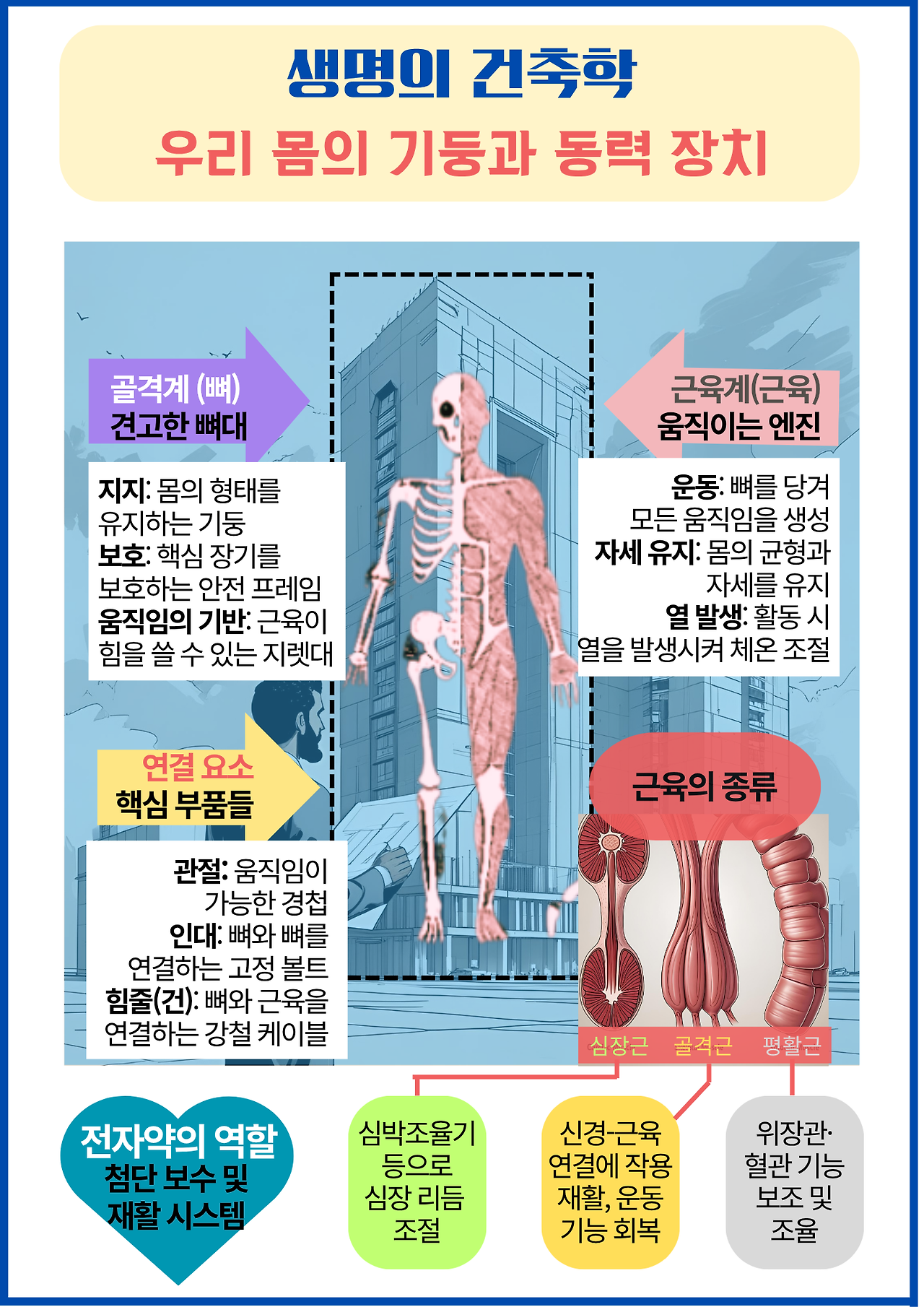 우리 몸에도 형태를 지탱하고 움직임을 가능하게 하는 건축적 구조—근골격계가 존재합니다.