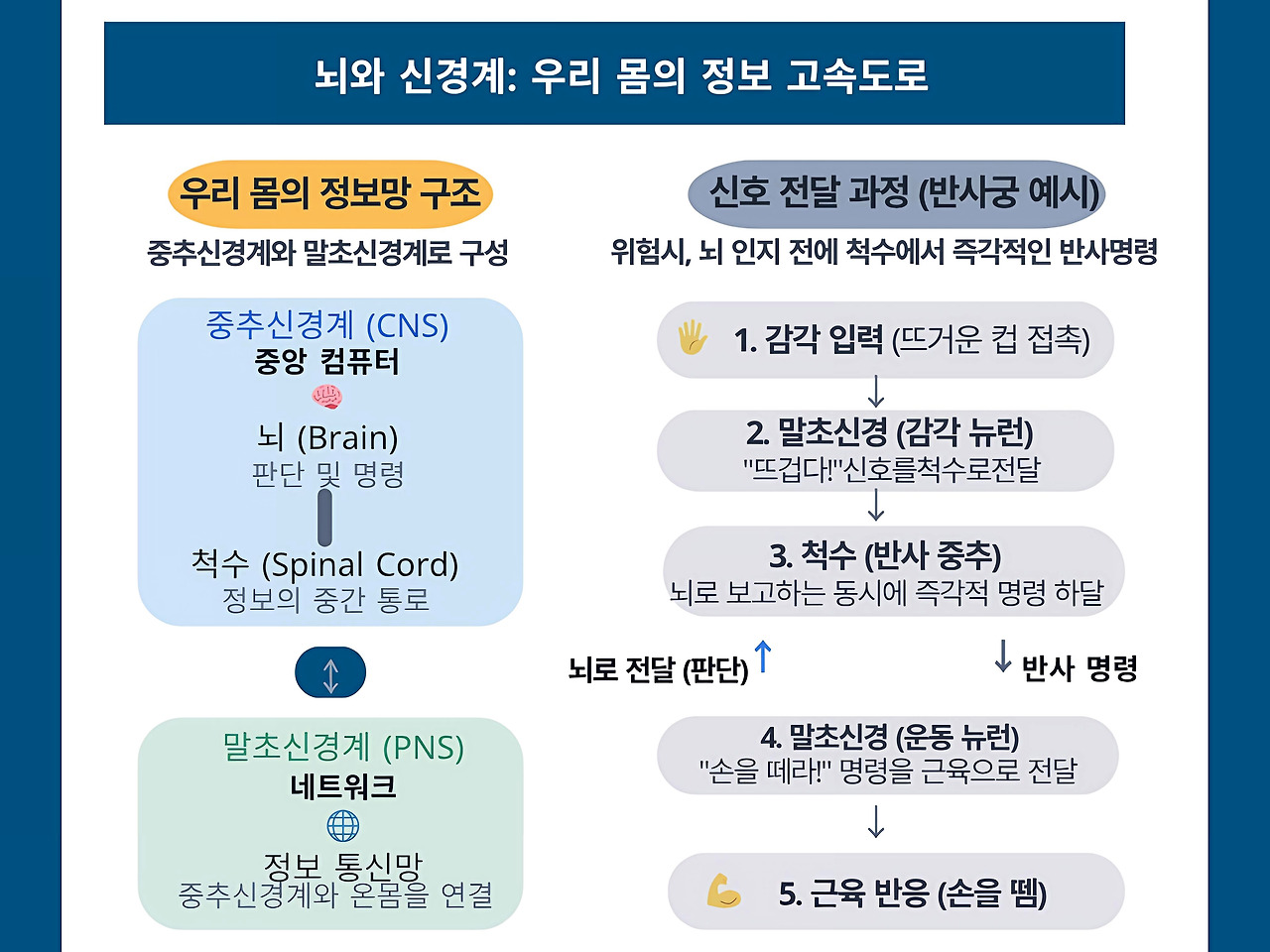 신호는 말초신경계(PNS)를 통해 정보의 중간 집결지이자 반사 중추인 '척수'를 거쳐, 최종 목적지인 '뇌'(CNS)로 전달됩니다.