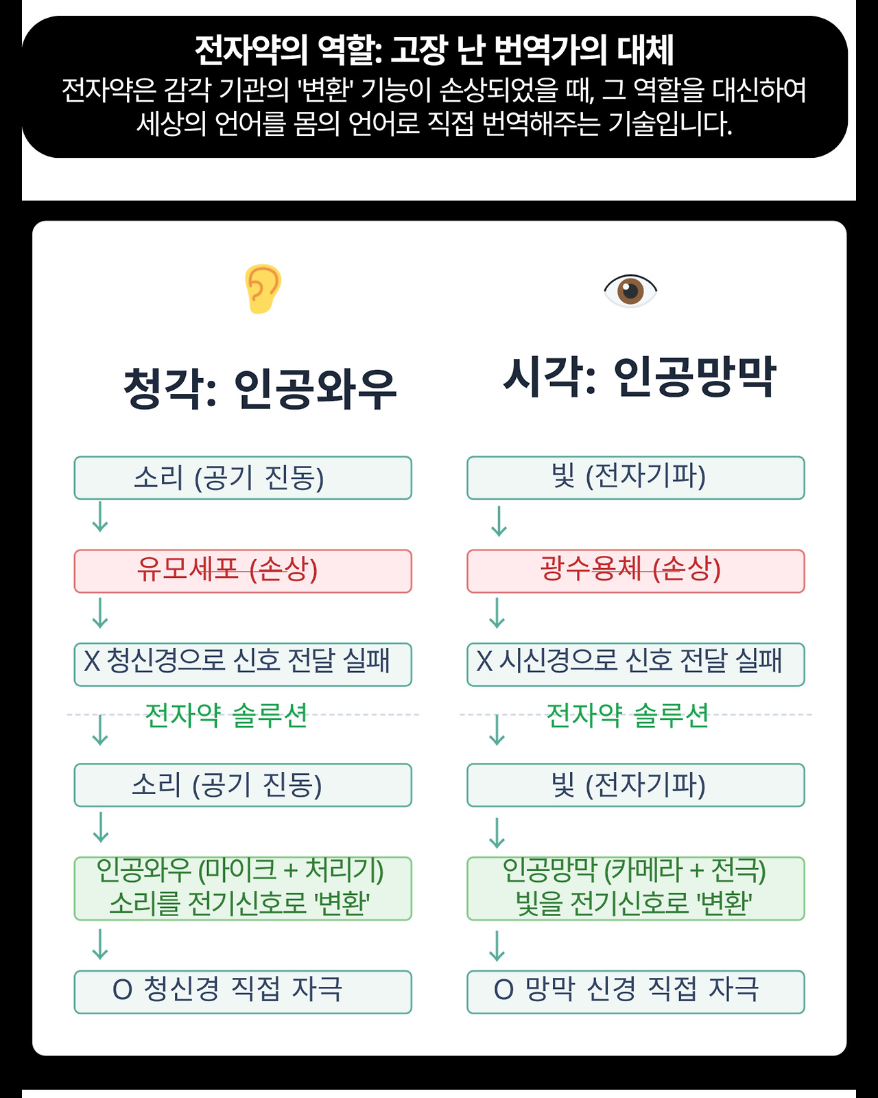 역할 A: 감각 기능의 '대체' 1단계 '번역' 과정에 문제가 생긴다면, 즉 감각세포가 손상되었다면 전자약이 그 역할을 대신합니다. 인공와우는 소리를, 인공망막은 빛을 직접 전기 신호로 '번역'하여 뇌가 인식할 재료를 다시 공급해 줍니다.
