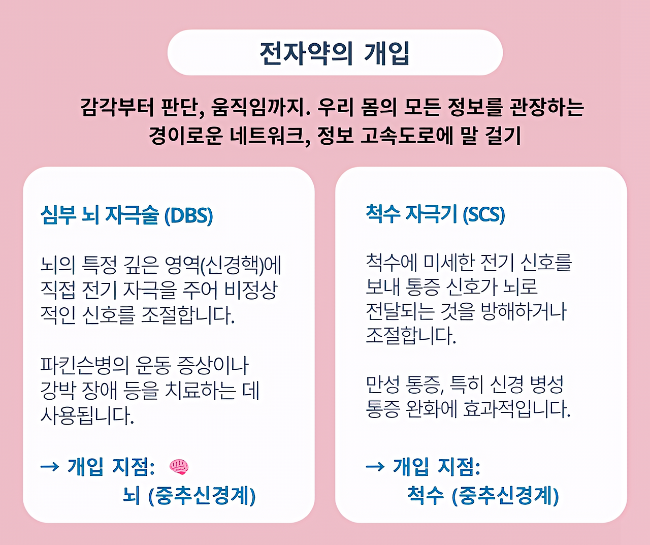 역할 B: 신경 정보망의 '조절' 만약 2, 3단계의 '전달'과 '해석' 과정에서 신호가 왜곡되거나(파킨슨병) 과도하게 발생하면(만성 통증), 전자약이 의료적 필요에 따라 정보 고속도로에 개입합니다. 심부 뇌 자극술(DBS)이나 척수 자극기(SCS)는 신경 신호의 흐름 자체를 직접 '조절'하여 비정상적인 활동을 바로잡습니다.