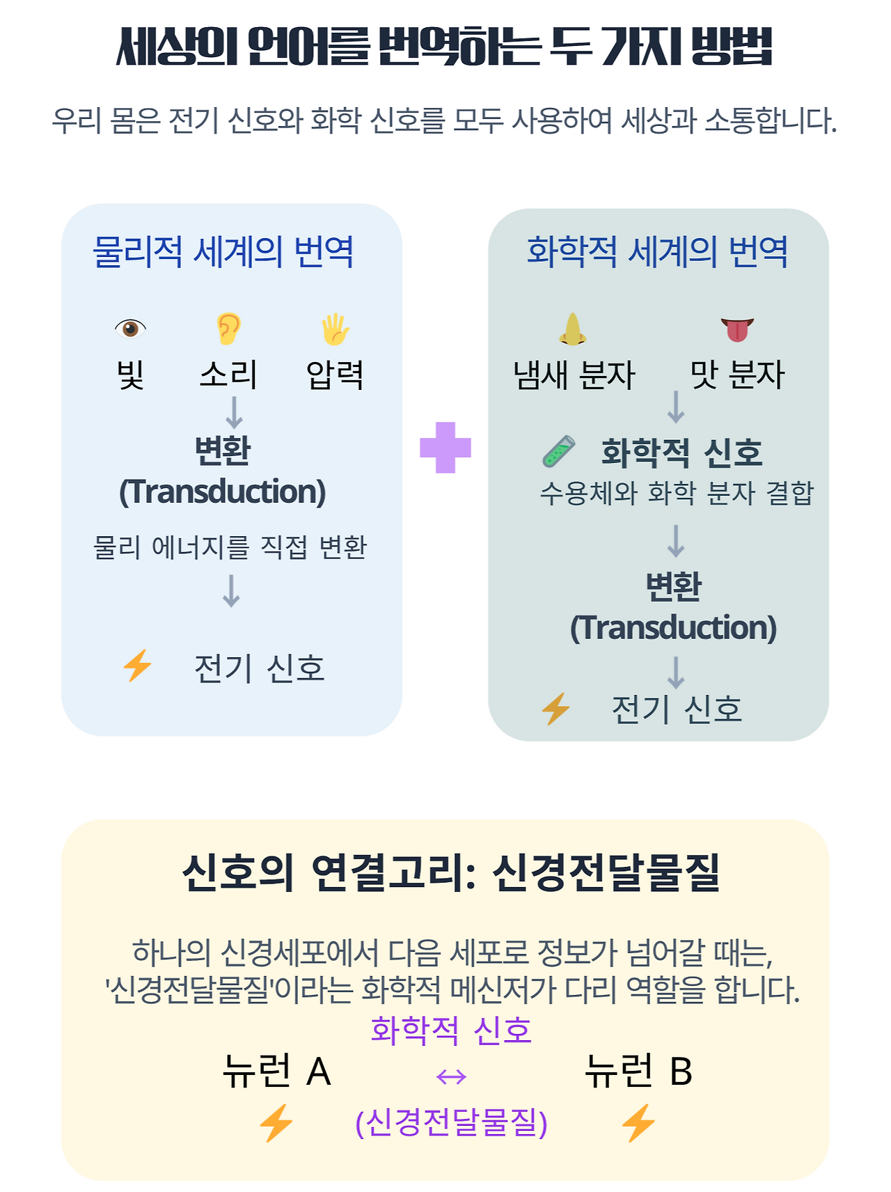 그것은 본질적으로 외부 세계의 다양한 에너지 형태를 우리 신경계가 이해할 수 있는 언어로 바꾸는 과정입니다.