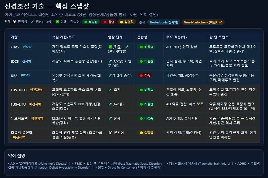 아래 도표는 다양한 신경조절 기술과 각 기술의 작동 원리, 임상 단계, 적용 질환을 정리한 것입니다.