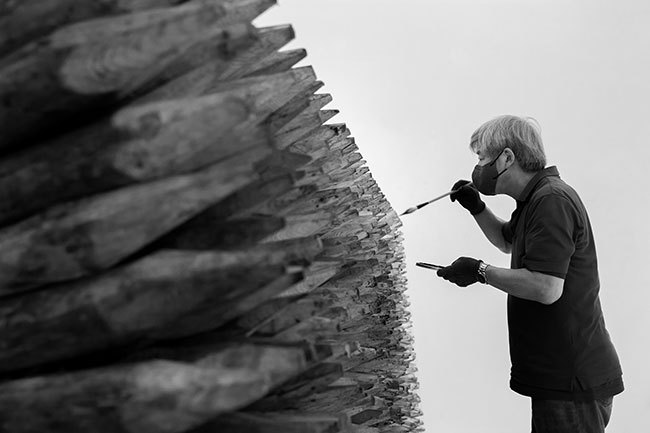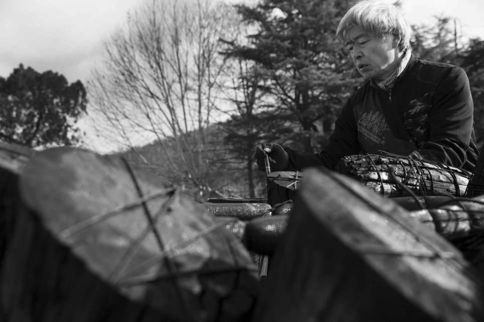 황토 가마 안에서 통나무를 1,000℃ 이상의 고온에 두었다 식히기까지는 꼬박 한 달이 걸린다. 이렇게 만들어진 숯을 다시 톱으로 썰고 깎아 작품으로 빚는 이배의 모습은 숙련된 기술을 연마하는 장인 같기도 하다.