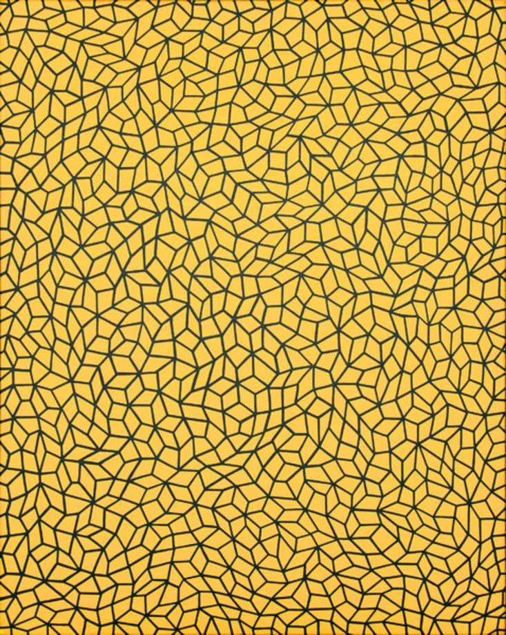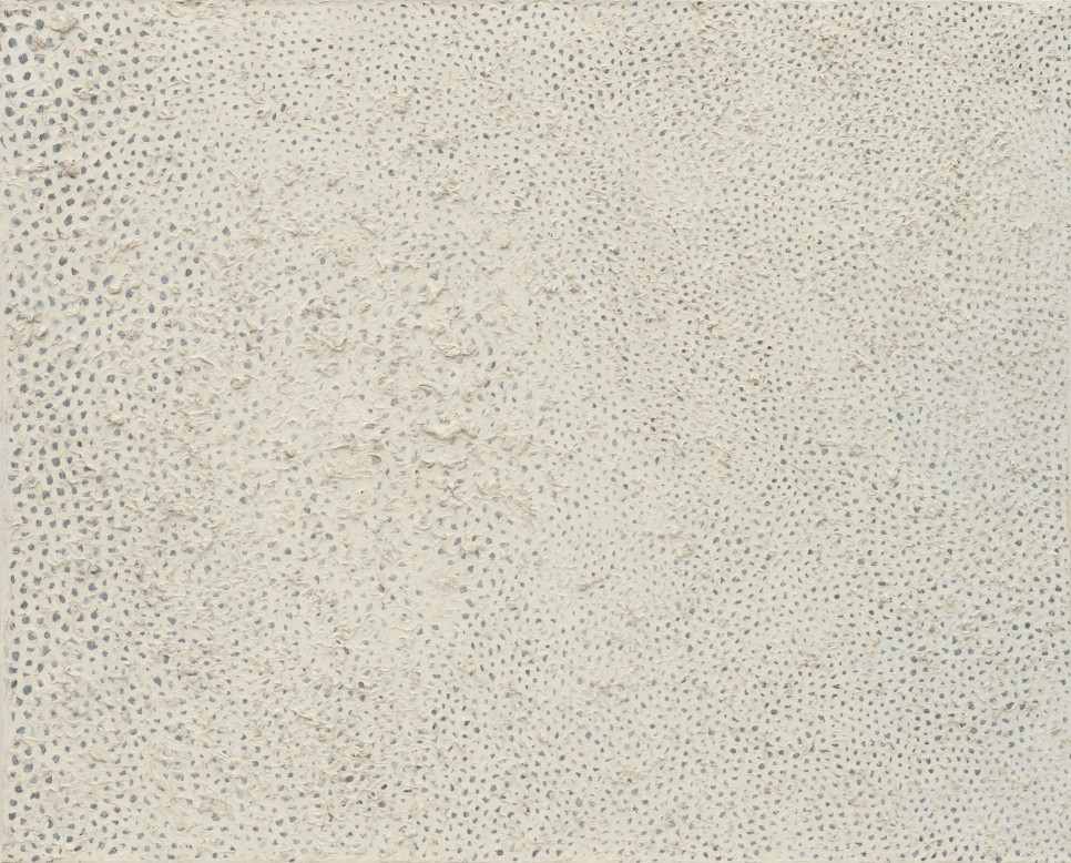 점은 사슬처럼 엮인 패턴으로 연속적인 짜임을 보여준다. 점을 잇다보면 리듬이 담긴 그물이 된다. '그물(Net)' 시리즈는 1959년부터 주목을 받았다. 뉴욕 브라타 갤러리(Brata Gallery)에서 첫 개인전으로 거대한 '무한 그물(Infinity Nets)' 5점을 공개했던 것이 그 시작이다. 일본을 떠나 뉴욕으로 온 지 1년 반만이었다. 지금으로 치면 '힙의 중심'인 곳에 등장한 무한 그물은 미니멀리즘의 개척자와도 같은 비평가이자 아티스트 '도널드 저드'를 놀라게 하기도 했다.