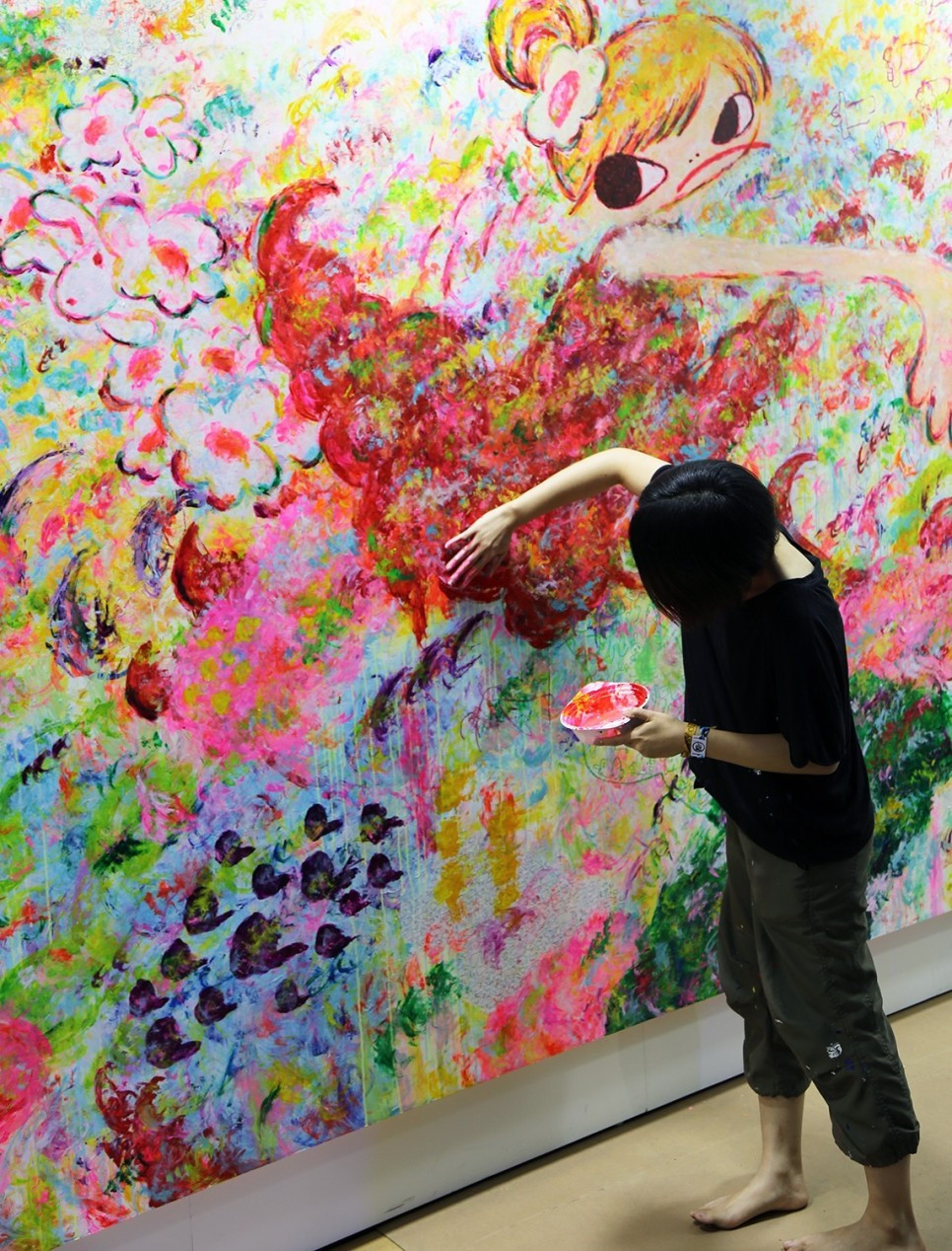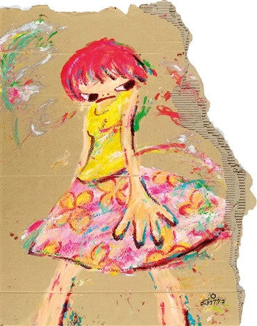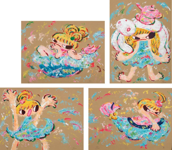 시그니처인 '작은 소녀'는 다양한 포즈로 골판지 위를 표류한다.. 익살스러운 표정을 짓거나 누워있고, 달리는 등 경쾌함이 가득하다. 그외에도 패브릭, 루이비통 수트케이스 등 다양한 표면에 그림을 시도하고 있다.
